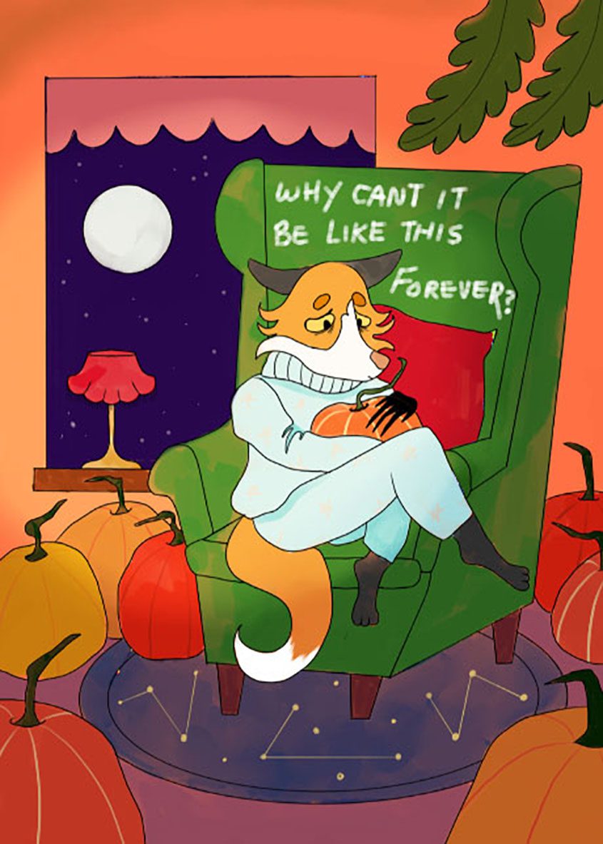 Love Autumn is a motion comic about love, autumn, and a fox. Created to accompany a poem written by Isabelle Kelly, this journey explores infatuation, longing, and acceptance. We follow a lone fox, walking through a beautiful autumnal wood. But instead of taking in the beauty of the season, the fox can only worry about when the season will end. Our fox character will soon come to learn that she has been focused on the wrong things in her life. Fleeting things should be loved and appreciated while they are here. Love will come back to you again and again. Love Autumn will enthrall you with its rich colours, soothing music, and thought provoking message. Hopeless romantics and lovers alike may see themselves in the wistful fox character. Find your favourite armchair, grab a mug of something hot and sweet, take a slice of rosy apple cake, and love autumn till the very end!