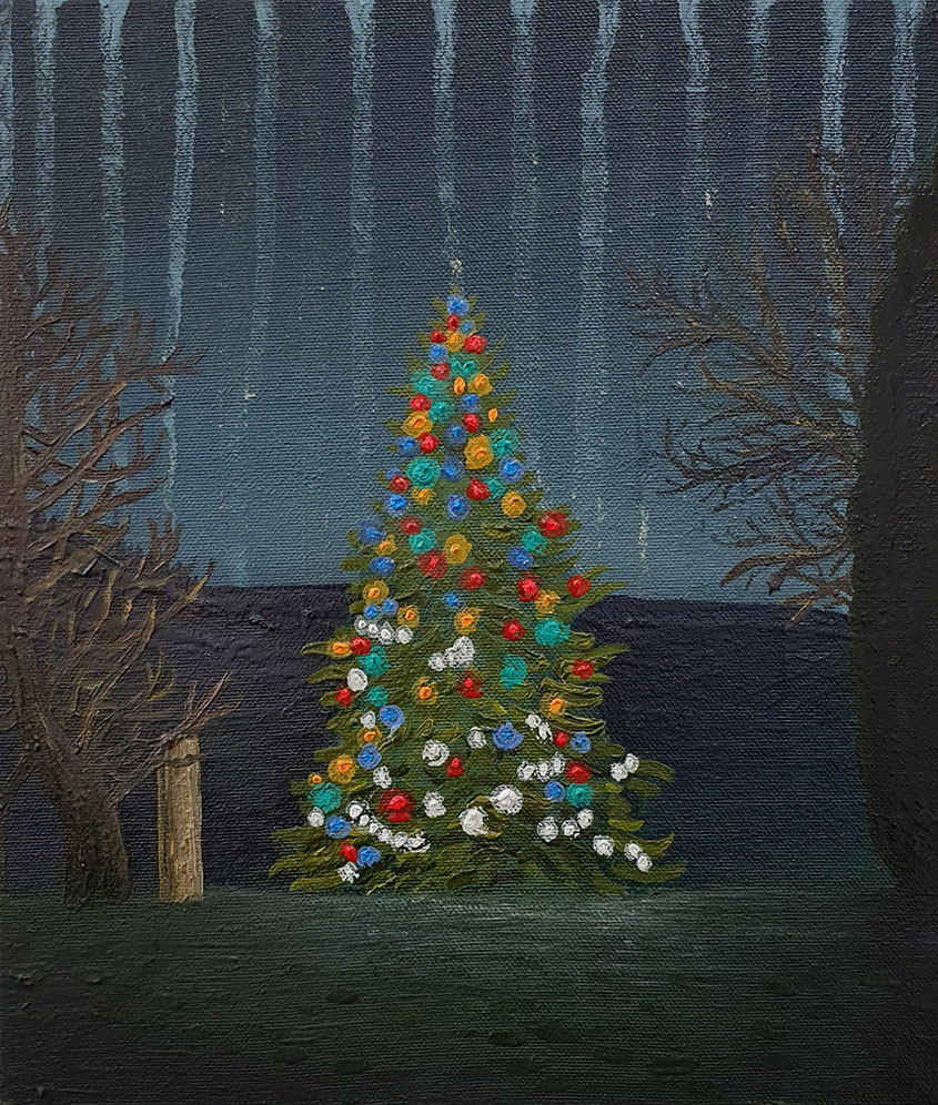 This body of work acts as an investigation of the human experience in relation to the land. Equipped with a phone camera, Wellwood captures and records what he encounters on his frequent evening walks around the farm and surrounding countryside where he grew up. He has taken his own path through this familiar landscape, fondly responding in his own way, observed through his eyes and life experience. Through a process of analysis in the studio, selected photographs were transformed into oil paintings.