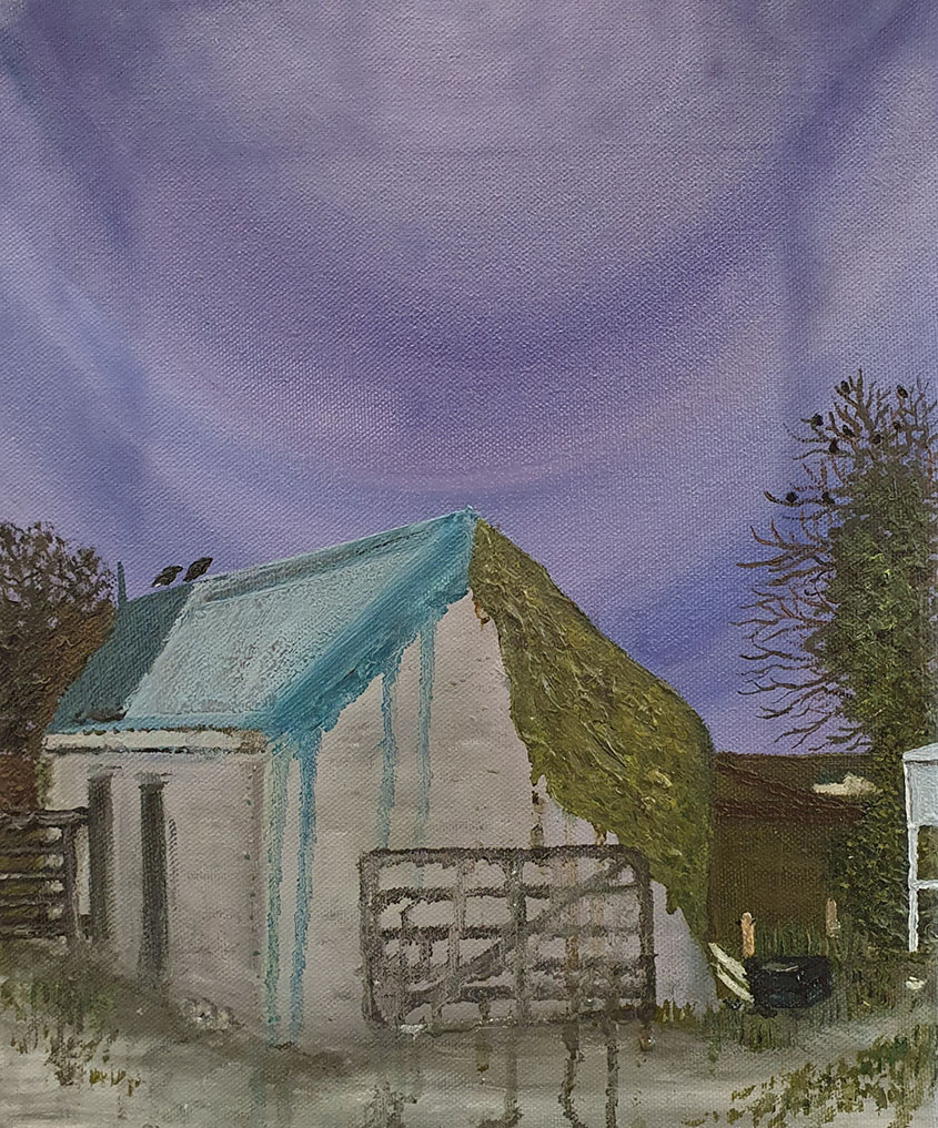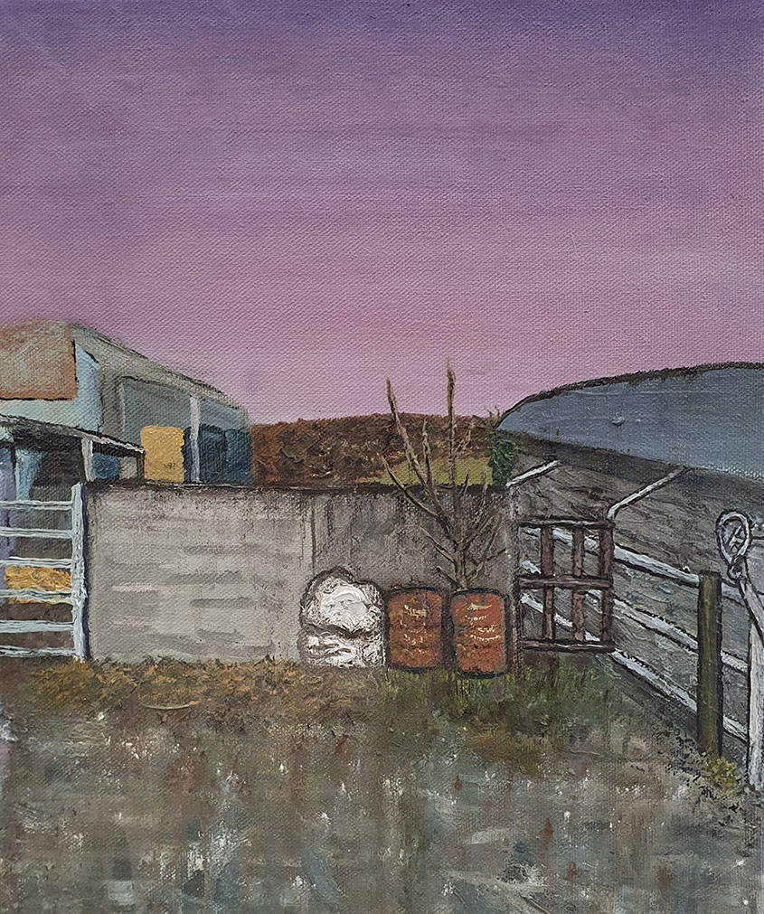 The recurring subject of the evening sky signifies transformation in Wellwood’s work. He is particularly fascinated by its myriad of colours and patterns and the otherworldly atmosphere that it creates amongst the farm buildings and surrounding countryside.