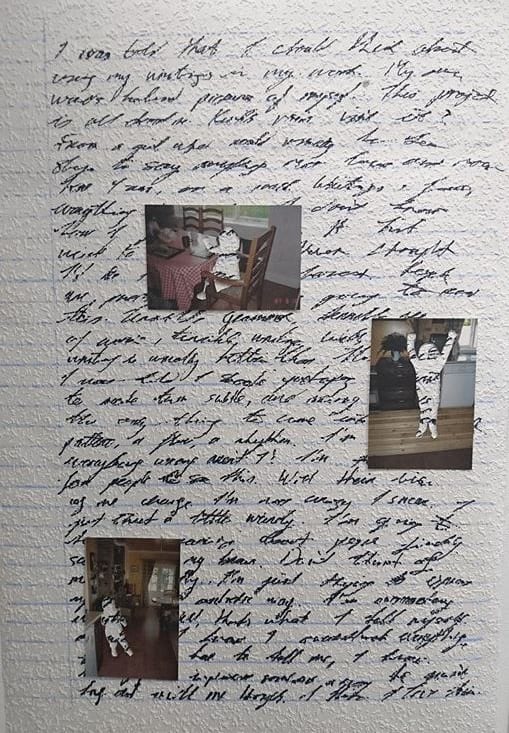 My work is based on mental health, primarily focusing on the effects of paranoia and anxiety. With the use of printmaking, photography and collage I was able to translate my emotions through art. Text is heavily present in my pieces, as I used automatic writings to convey my emotions throughout. The writings are juxtaposed onto the wallpaper. I wish for the viewer to immerse themselves into my piece and have to go up close to be able to read my writings. Although these pieces are about me and my emotions, I don’t show my own face. Using both still images and moving images, I wanted to give an eerie sense of life and movement to my work. With the use of collage, I wanted to convey a sense of deconstruction, how the brain deconstructs and overanalyses every aspect of life while experiencing paranoia and anxiety. I want the viewer to be able to create their own story, and project their own emotions onto the pieces, rather than be told how to feel.