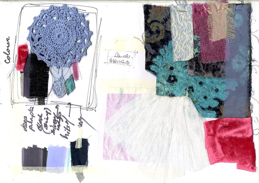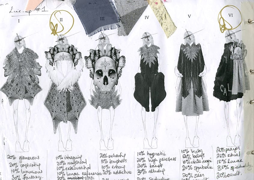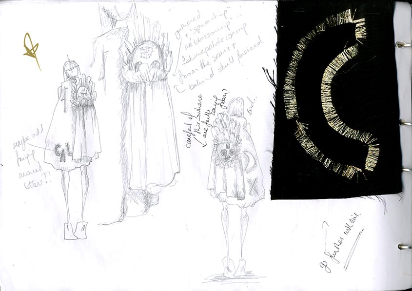 in which the moon is seen as a powerful and alluring female deity. I drew inspiration from both the extravagant Folie costumes and traditional ritualistic attire. In order to portray the exuberance and mysticism of my inspiration, I created unique and personalised fabrics and trims by use of hand dying, applying glitter, pleating, gathering, stitching and appliqué techniques. My collection embodies a celebration of vintage frivolity and female adornment, coupled with spiritual symbolism referencing the moon and stars.