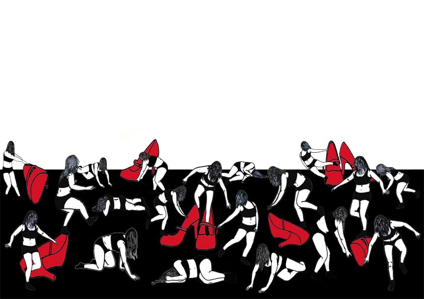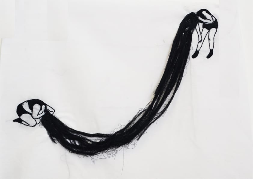 Jennifer Shaughnessy’s work explores the concept of female identity. Hair has been a very important feature within her pieces due to its relationship to the female figure, the abject and in this case the concealment of one’s identity. Using a simplistic line Jennifer develops a character that is biographical yet universal and through this character expresses the psychological, political and social activities among various women.