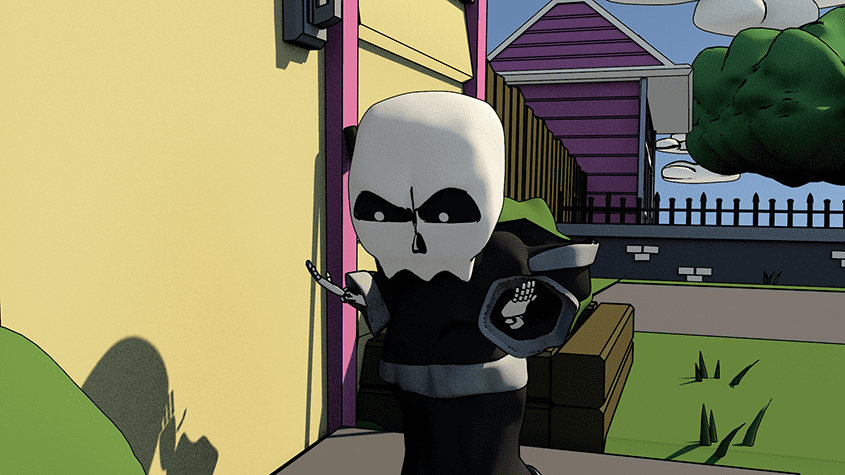 The film was animated in Maya using Arnold Renderer and Arnold toon shaders to give it a vibrant cartoony feel to contrast with the somewhat more mature subject matter. The bright pastel feel is to contrast against the strong monochromatic tones of the character’s cloak and indeed, himself, to accentuate his discomfort and to establish him being out of his own element. The project was conceived as a one-off story concerning characters from a larger branching story planned in previous years.