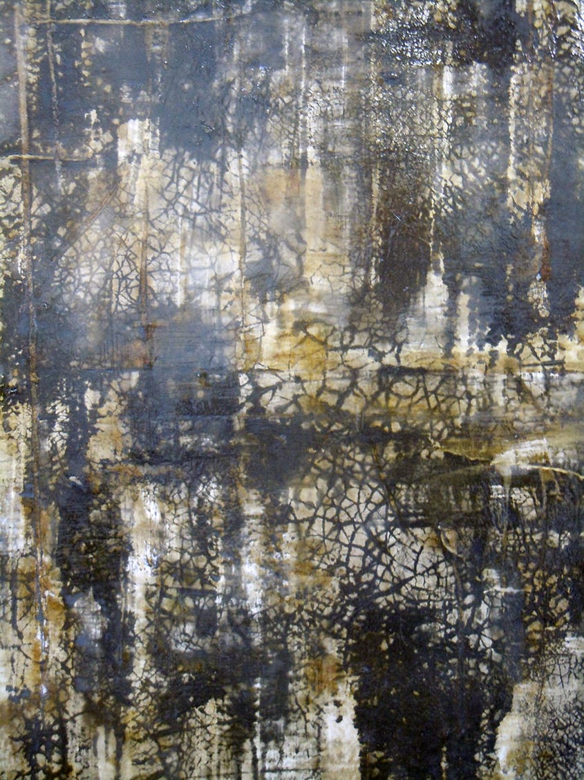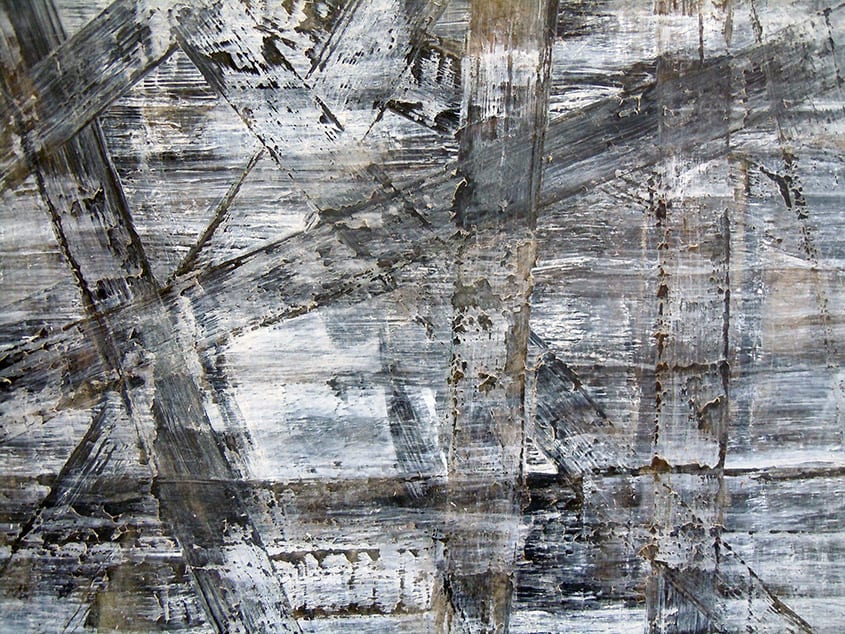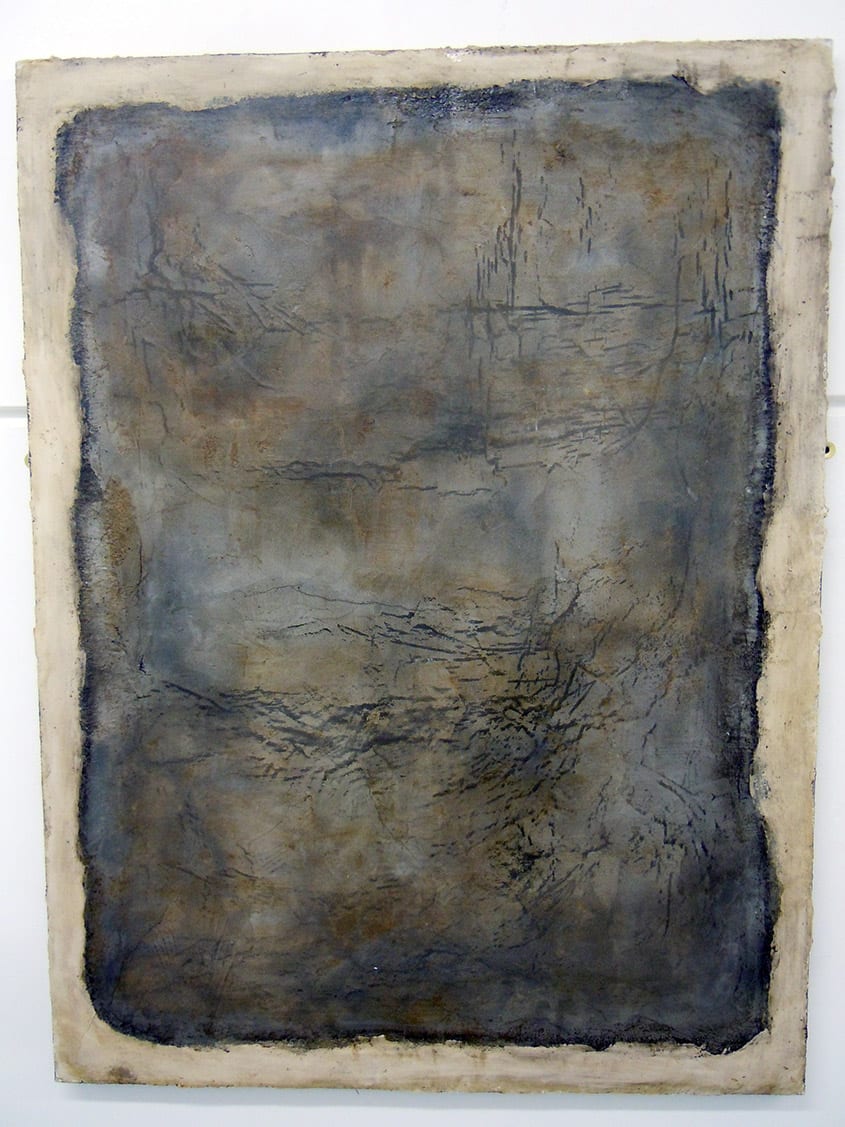 Jerry O’ Sullivan’s experience as a mason has informed his methodology as an artist. Working with the tools of his former trade, his work reflects the materiality of the urban world. His canvases are abstract, some of which resemble weathered walls and peeling layers of paint scored by time. He uses archaeology as a metaphor for his practice, the slow scraping away of the surface to reveal the past. Excavations and fragments are common themes in his work.