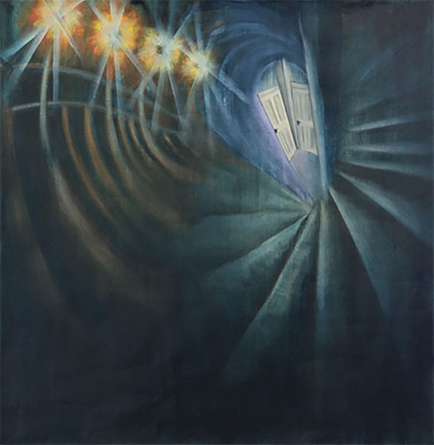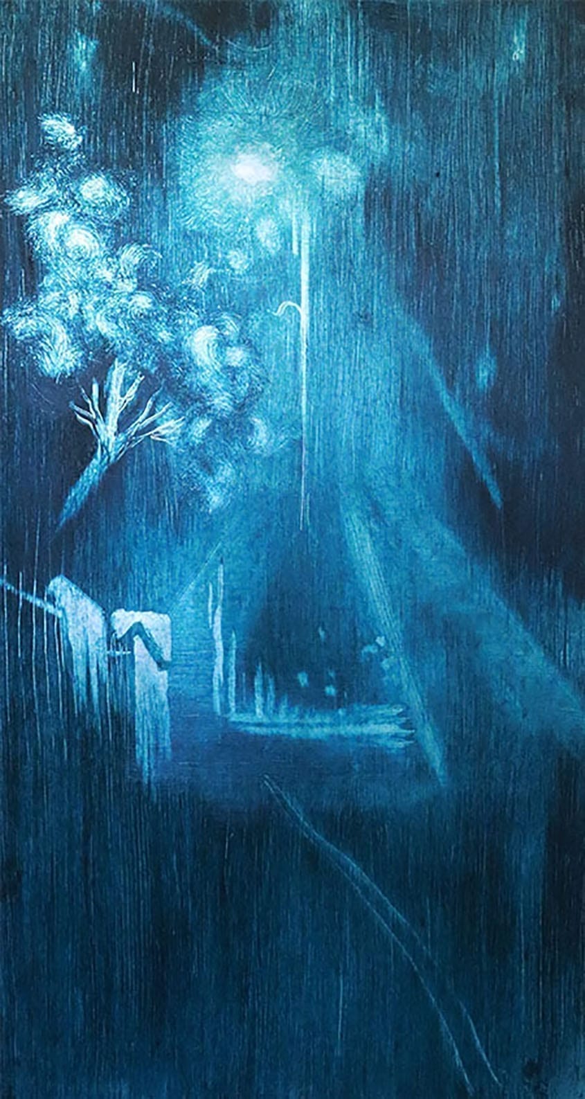 The work of Jessica Adcock explores the borders between natural and man-made, real and imaginary. Representation borders on abstraction as the artist uses elements of photography and film stills of water, street photography and interior spaces to provide the suggestion of a place in her paintings. The process of applying and erasing layers of paint, exposing what lies beneath the murky, monochromatic surface of the painting allows an ambiguous narrative to arise. This action involves coalescing various aspects of perception into a liminal place of existence. The viewer is invited to wander the labyrinth of urban life and the beliefs that have been embedded into it, and encouraged to use a sense of curiosity and wonder in transcending this eternally transient surface to its nocturnal underpinnings that are a reflection of the familiar but also an intensely quiet and abstruse version of what the day’s light quells. Gestural and faded brushstrokes emphasise the transience of these places and life itself as rigid structures and borders begin to stretch and distort and new perspectives are gained.