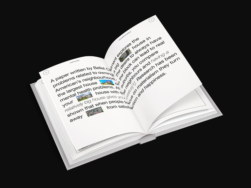The book is a journey through how we experience our home as an extension of the individual self. It includes different examples of living, from the luxury mansion to the tiny house. This project is to raise awareness of the way we live, and it displays that often downsizing our lives help us being more connected with ourselves, with the others and with everything else around us.