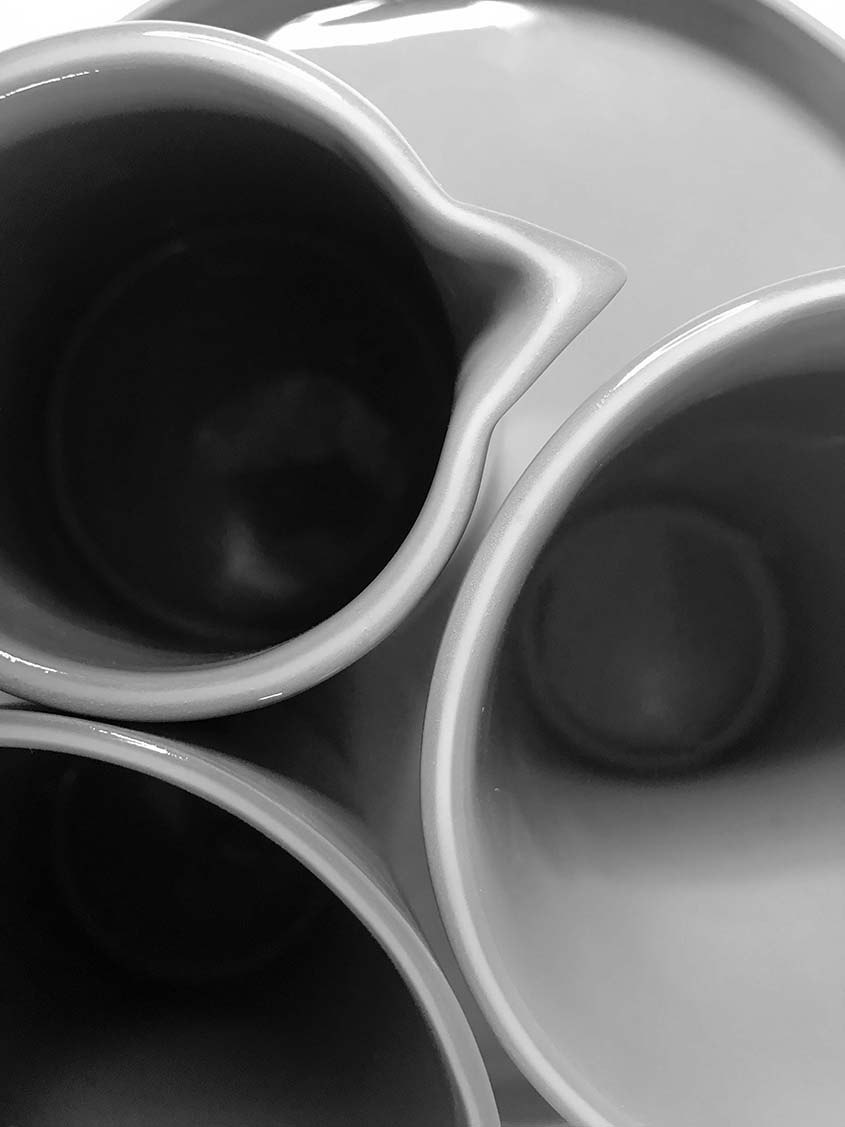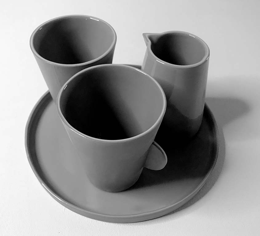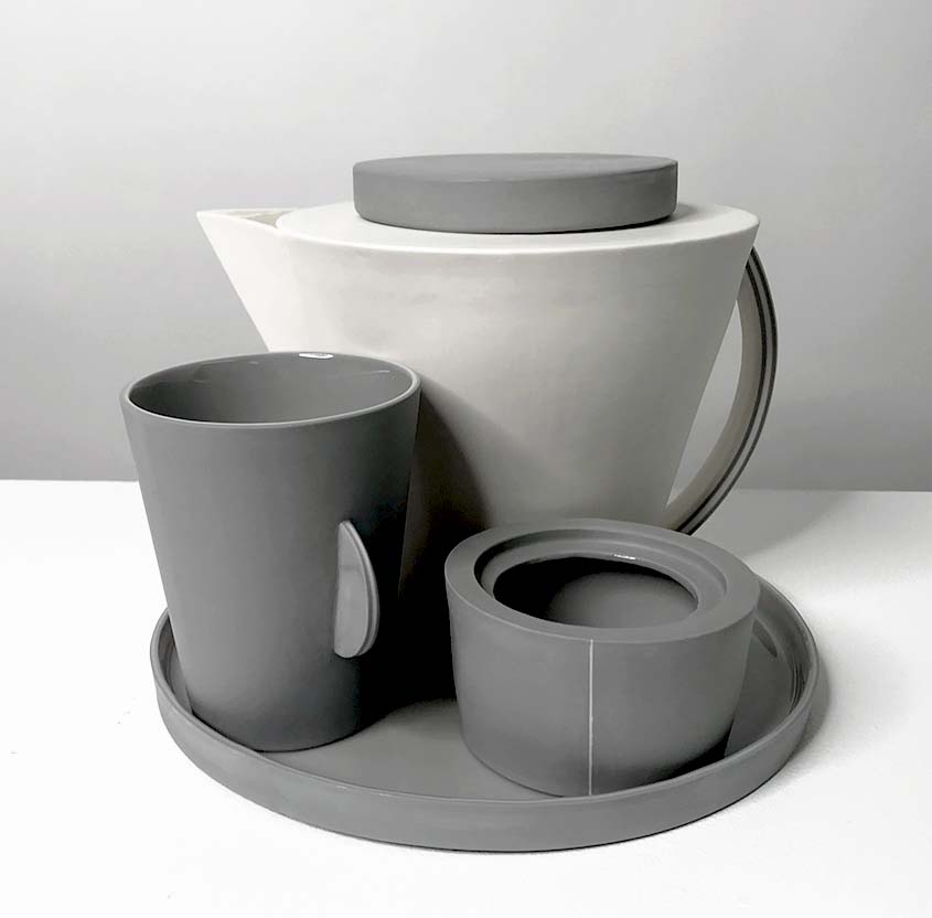The functional domestic object has a significant place in art history, through considered arrangement in the carefully composed traditional still life. My work builds upon this idea of compositional objects, functional when apart, decorative when together. Taking inspiration from the minimalist ethos of ‘less is more’, I explore still-life through my functional tea sets where placement of every element is considered. The Geometric vessel forms are minimal in design yet complemented by the addition of linear surface decorations that echo traditional object forms and suggest a curated composition for display.