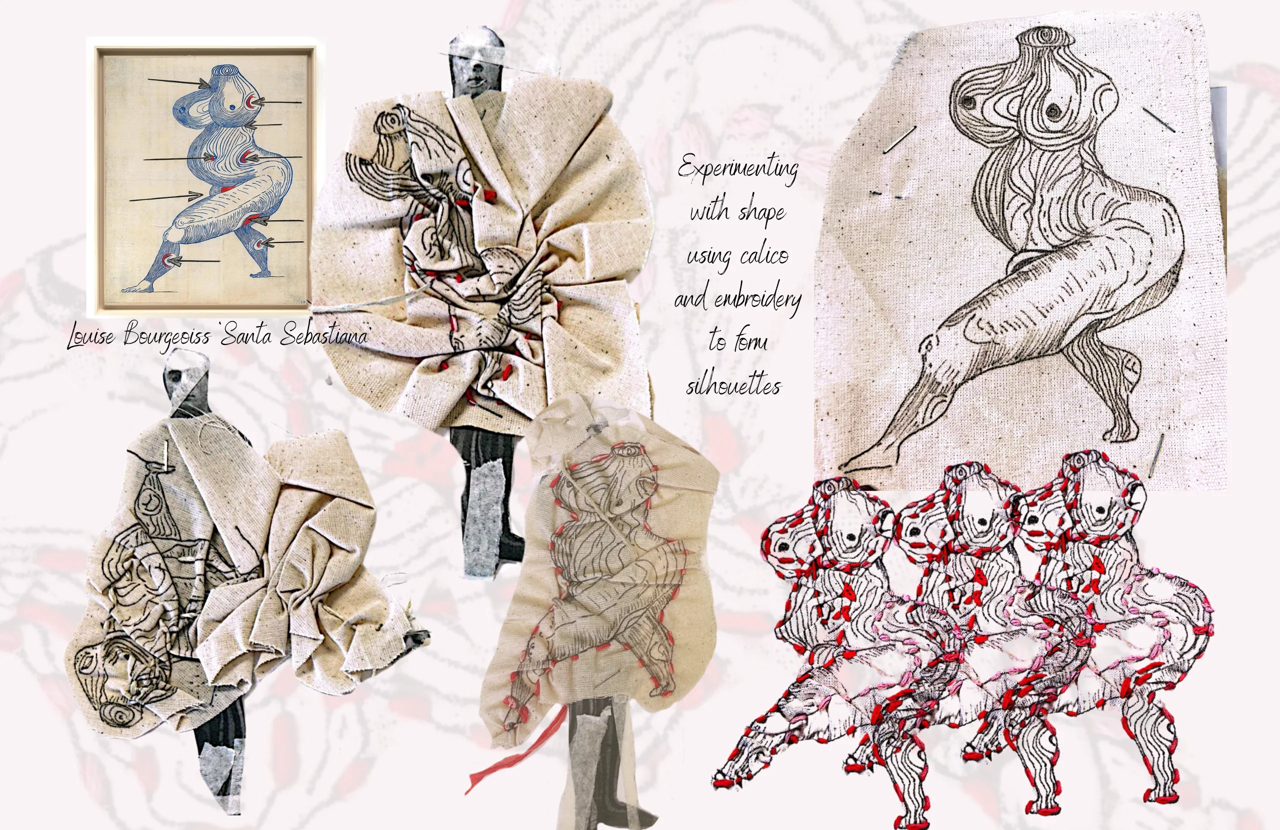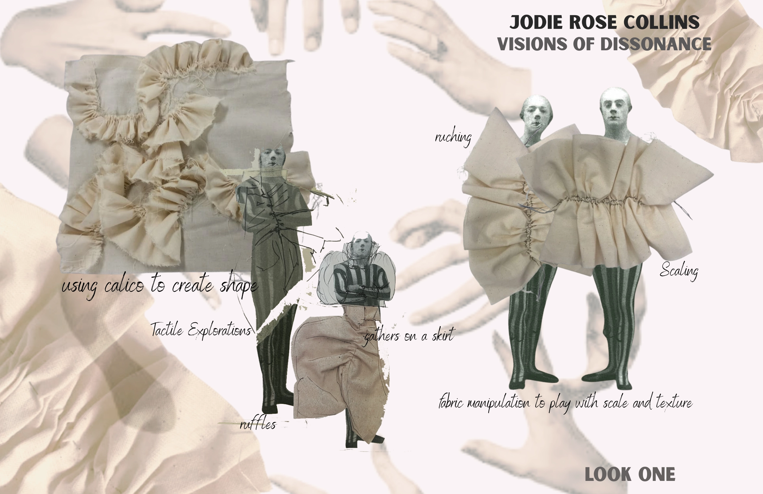 I began developing silhouettes by translating elements of surrealist art into experimental fabric manipulation samples. These tactile explorations became the foundation of my design process, as I shaped and draped them onto the form of the Pierrot. This allowed me to explore the expressive potential of the materials and push the boundaries of my concept, blurring the line between abstraction and figure.