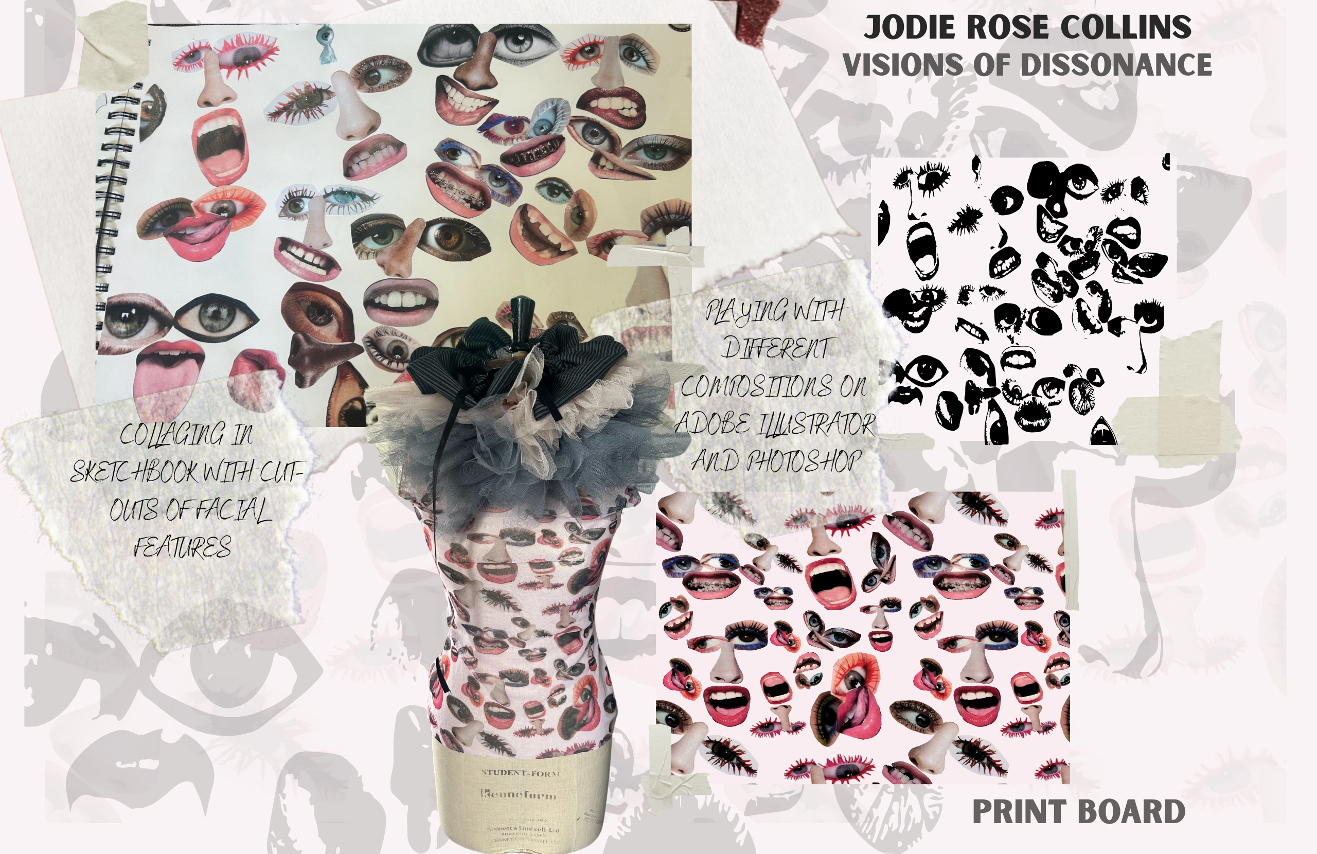 To refine my vision, I used CLO3D to experiment with scale and proportion. The digital platform allowed me to explore and perfect my designs in a virtual space, ensuring they stayed true to the surreal, art-inspired concept before translating them into physical form. I designed a custom print inspired by my concept. I began by collaging cut-out fragments of eyes and mouths, creating distorted, unsettling compositions. This hands-on approach allowed me to manipulate the facial features in unexpected ways, evoking an eerie and surreal quality that aligns with the theme of my collection. The print was strategically incorporated throughout the collection, subtly reinforcing the surreal, dreamlike atmosphere and highlighting the juxtaposition of beauty and discomfort.
