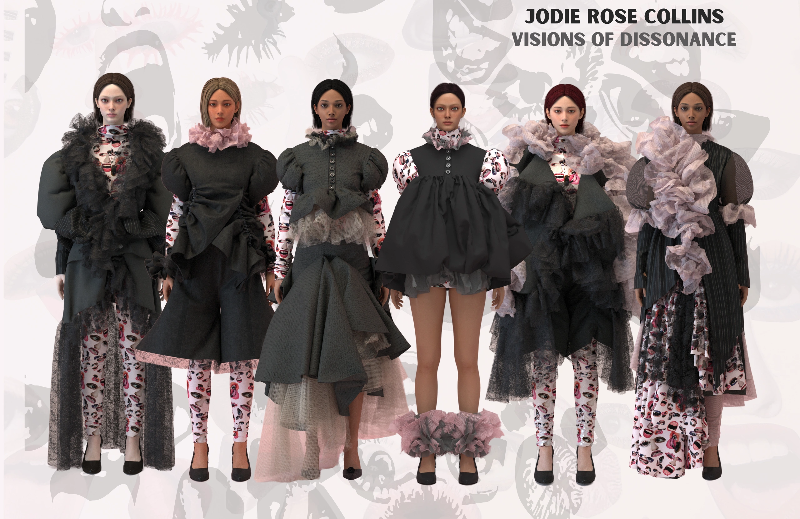 My graduate collection, ‘Visions of Dissonance’ is rooted in the surrealist movement and its celebration of the bizarre and the uncanny. The designs explore distorted perceptions of identity, challenging the viewer to question the boundaries between reality and imagination, comfort and discomfort, seriousness and play. I have long been captivated by the eccentricity of French Pierrots, their haunting presence and the enigmatic atmosphere they evoke. This sense of unease became a driving force in my creative process, allowing me to deepen my exploration of apprehension and channel it into garments that are both visually unsettling and emotionally resonant.