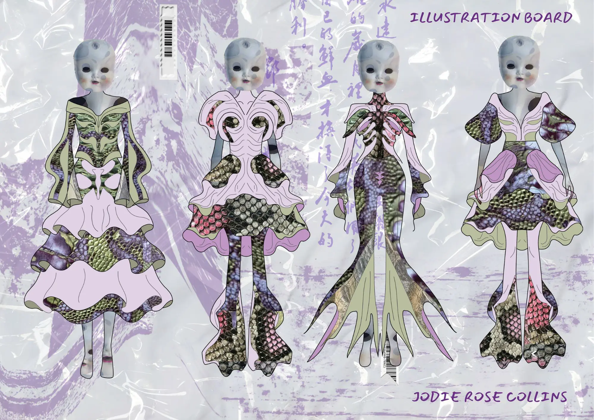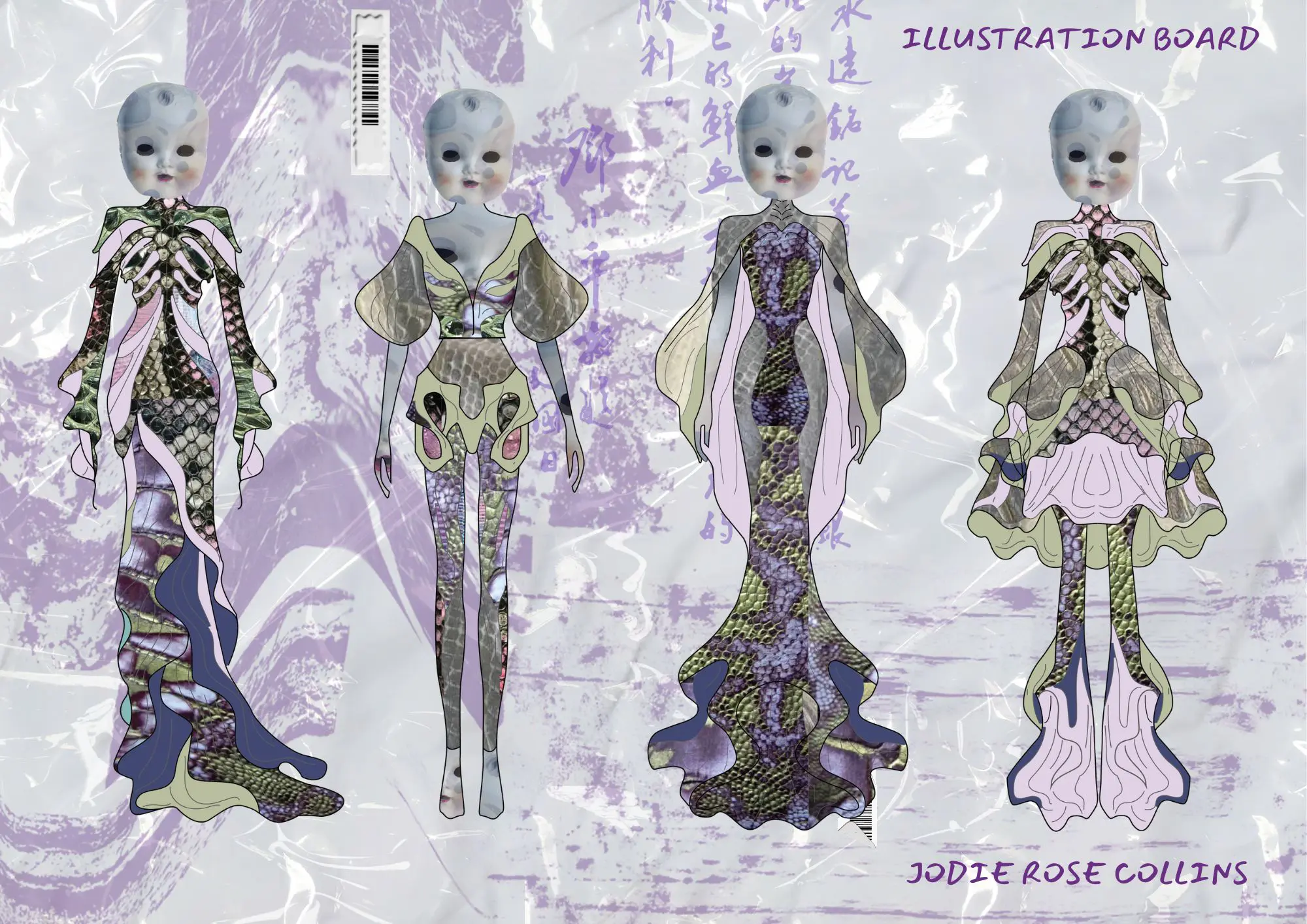 Using Adobe Illustrator, I developed designs that translate the fluid anatomy and skeletal shapes of these preserved creatures into fashion silhouettes. The lineup features surreal, alien-inspired figures, incorporating rib-like structures, jointed curves, and textures that mimic stained cartilage and bone.