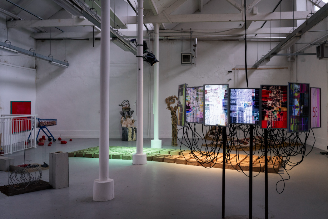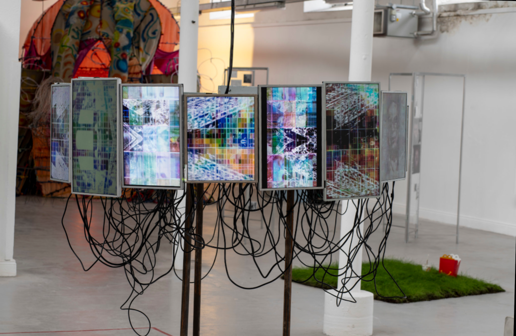 Altar to the Fallacy of Pepetual Growth’ consists of a network of microcomputers which play back an audio-visual composition with a delay of three frames between each successive monitor. The video itself is a layered, experimental abstract film created from a wide range of sources, including footage and photographs which were captured over four years, alongside found video, audio, and sound material.