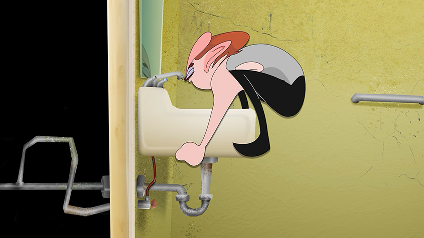‘Water Hole’ centers around the daily routine of a mild mannered and particularly stinky man named Jack Schitt. Like his grimy and dowdy self, his dingy and decrepit bathroom suits him well. Of course, like every morning, Jack needs to get ready for work with a quick washing up. Unfortunately for Jack, while going through his usual routine, he is interrupted by a lack of running water. Having never questioned where his water supply comes from, he is forced to investigate that very question, leading him down deep into his pipe system. His journey may lead him to discover more than he ever expected…