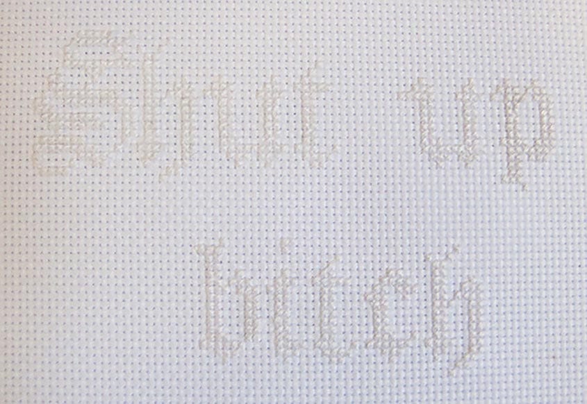 Like these assailants’ actions, I have extracted and hidden their words among the everyday domestic life. The viewer is drawn to look closer.