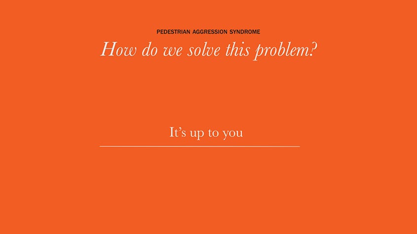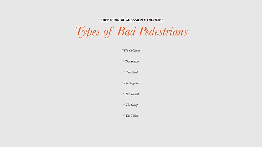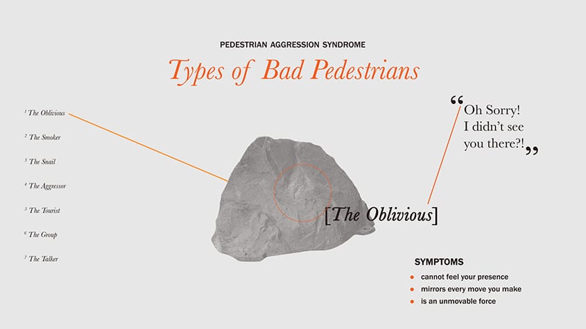 The project highlights the problem of pedestrian aggression in society today. For many people, few things are more infuriating than slow walkers and those who clog footpaths, while those stuck behind them get angry and annoyed. Pedestrian aggression is something that most people encounter and some find themselves in this situation everyday.