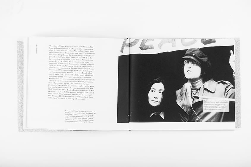 1969: The year that changed everything. The design for this editorial book is based on a tense interview conducted by Al Capp with John Lennon and Yoko Ono at their bed in for peace in Montreal on the 26th May, 1969. The 180mm x 220mm format represents the shape of an old-style black and white television which would have been typical of the time, with a minimal colour palette of black, white and grey to reinforce this. A combination of serif and san serif typefaces illustrate the debate against a backdrop of documentary screenshots. Large, bolder spreads represent Al Capp, while softer, consistent spreads are used to portray Lennon’s character.