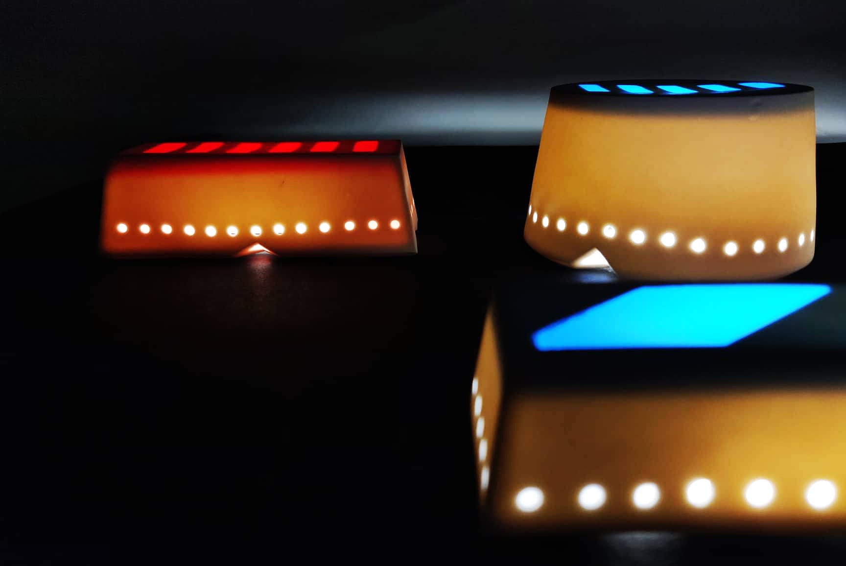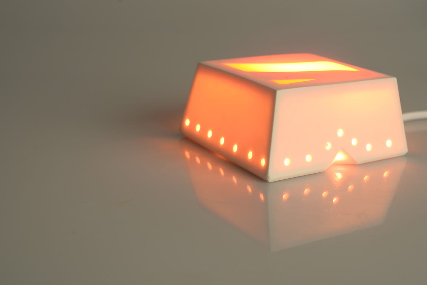 I aim to bring this sense of envelopment into the domestic space though light compositions. Each piece, which juxtaposes porcelain with coloured resin, transports the viewer into an urban still life of warmth and wonder.
