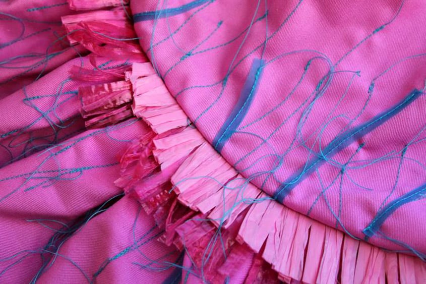 in the bloodstream. It is an investigation into the struggle of the immune system versus the virus, which ultimately takes control of its host. Inspired by veins, the silhouette and patterns mimic the ebb and flow between tension and calm as the virus multiplies and conquers. My aim was to marry the use of texture using raffia and embroidery while maintaining an interesting silhouette.