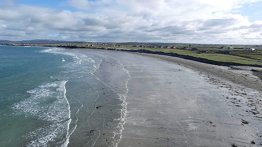 As an artist, her work is influenced by how she visually responds to landscapes, found objects and the environment. As part of her artist practice she has concentrated on the photographing and displaying of these found items. She recorded aerial footage of Quilty, to gain a birds-eye perspective of the beach terrain. From this elevated view point, the beach looked relatively well kempt. But in reality the seaweed on the beach was blighted with plastics. Taking this in to consideration she uses her artwork to highlight this disruption.