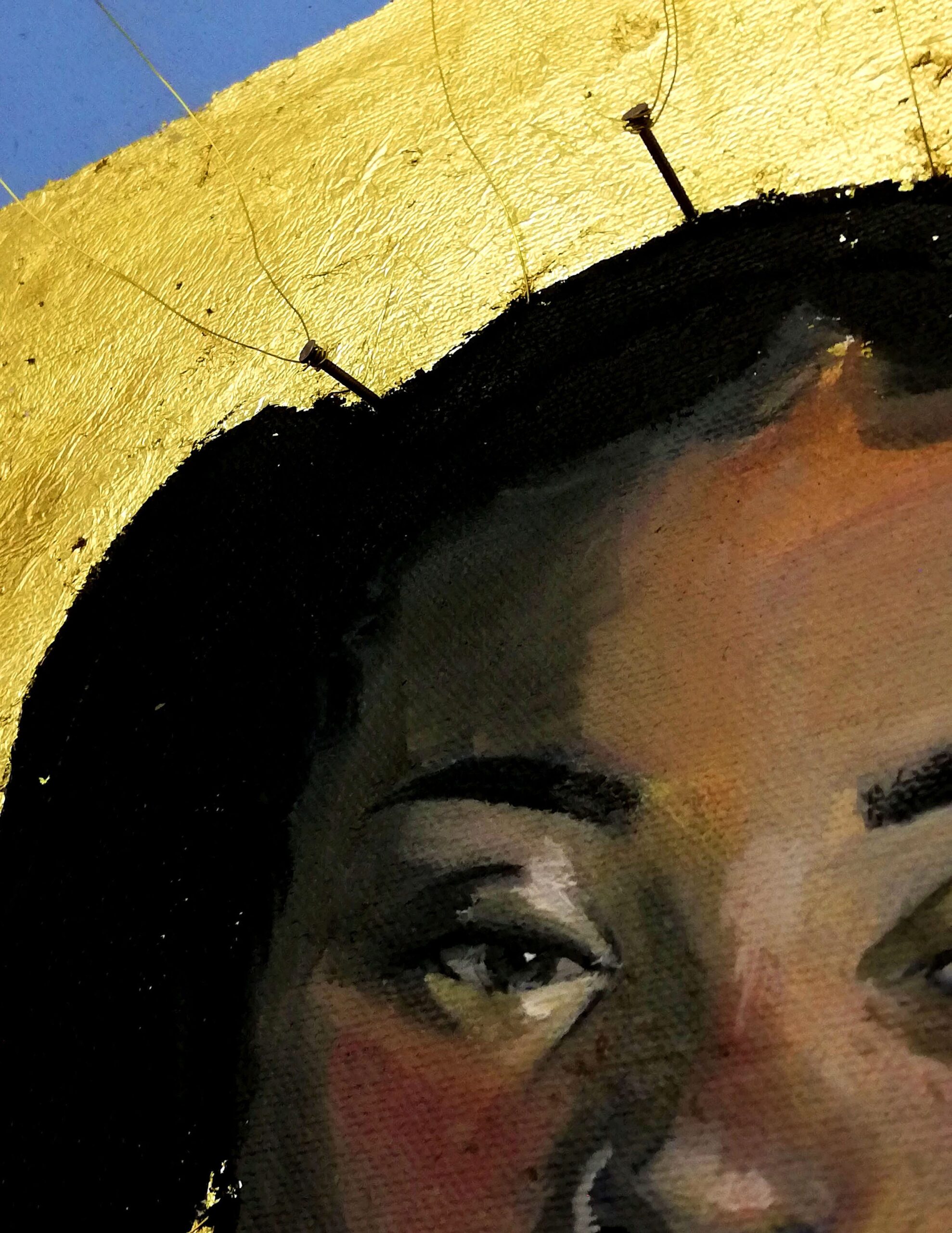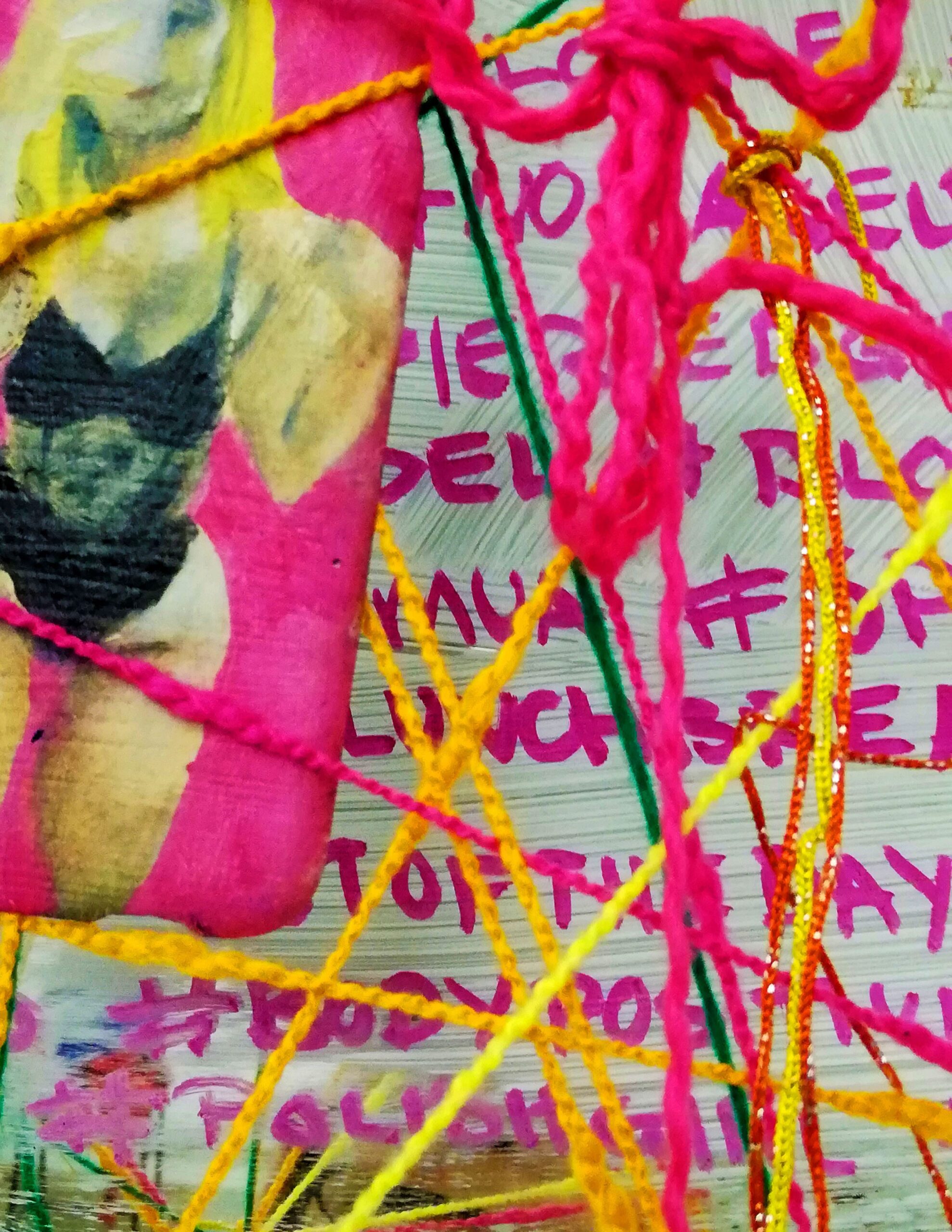 Kayleigh Berry’s fine art practise aims to explore contemporary society’s relationship with self-image. Technology and social media dunks our minds into an ever-sustaining tank of information and community. Our bodies, shrunken into themselves, becoming mere limbs. Our legs and arms, breasts and faces, become posters and mannequins, malleable and commodified. In response, Berry’s practise explores how the very act of painting allows one to view, experience, interpret and translate exclusively by the unification of body and mind. She attempts to tug at contemporary representation, pull it back and see how far it can stretch; Further aiming to challenge the image of the contemporary woman and ask her to define herself under the language of primal humanity. Berry uses the image of the female nude, calling back to classical painting while calling forward to modern female identity and sexuality. Colourful string and repetitive text emulate a web of over-saturation. Large selfies, blue and gold, hint to religious iconography, virtue and the divine feminine. Berry’s practise aims to enquire: How does our technological contemporary society toy with her image? Transcending beyond the screen, into the physical world, through the nature of human choreography, Berry’s paintings hope to challenge the disconnect between mind, body and meaning.