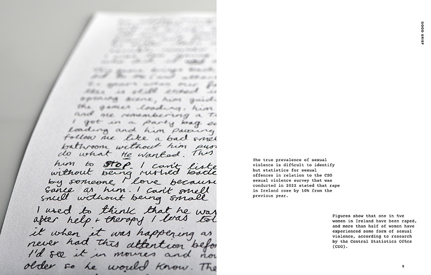 Kayleigh’s work delves into the symbolic meaning of objects in the aftermath of sexual assault. Drawing inspiration from Julia Kristeva’s concept of abjection, her work offers a unique and deeply personal perspective on the enduring effects of trauma. Through photography and handwritten accounts, she aims to bring visibility to the healing process and lasting impact of such experiences. This collection serves as a tender offering of visual, emotional and textual elements, inviting viewers to explore the depths of personal symbolism and the power of objects to tell stories.
