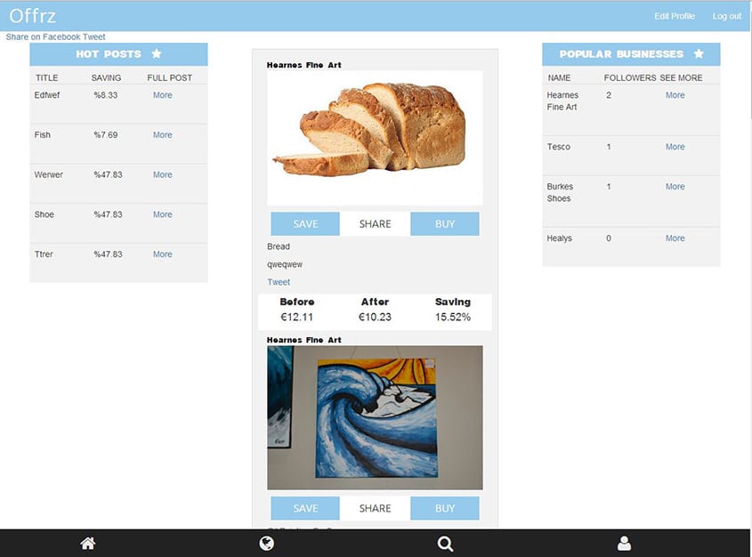Offrz has been built to cover three different viewpoints: a business user, a business customer and an admin user. The business customer view allows users to save, follow and go directly to the product page of the product on offer, via the ‘Buy Now’ button.