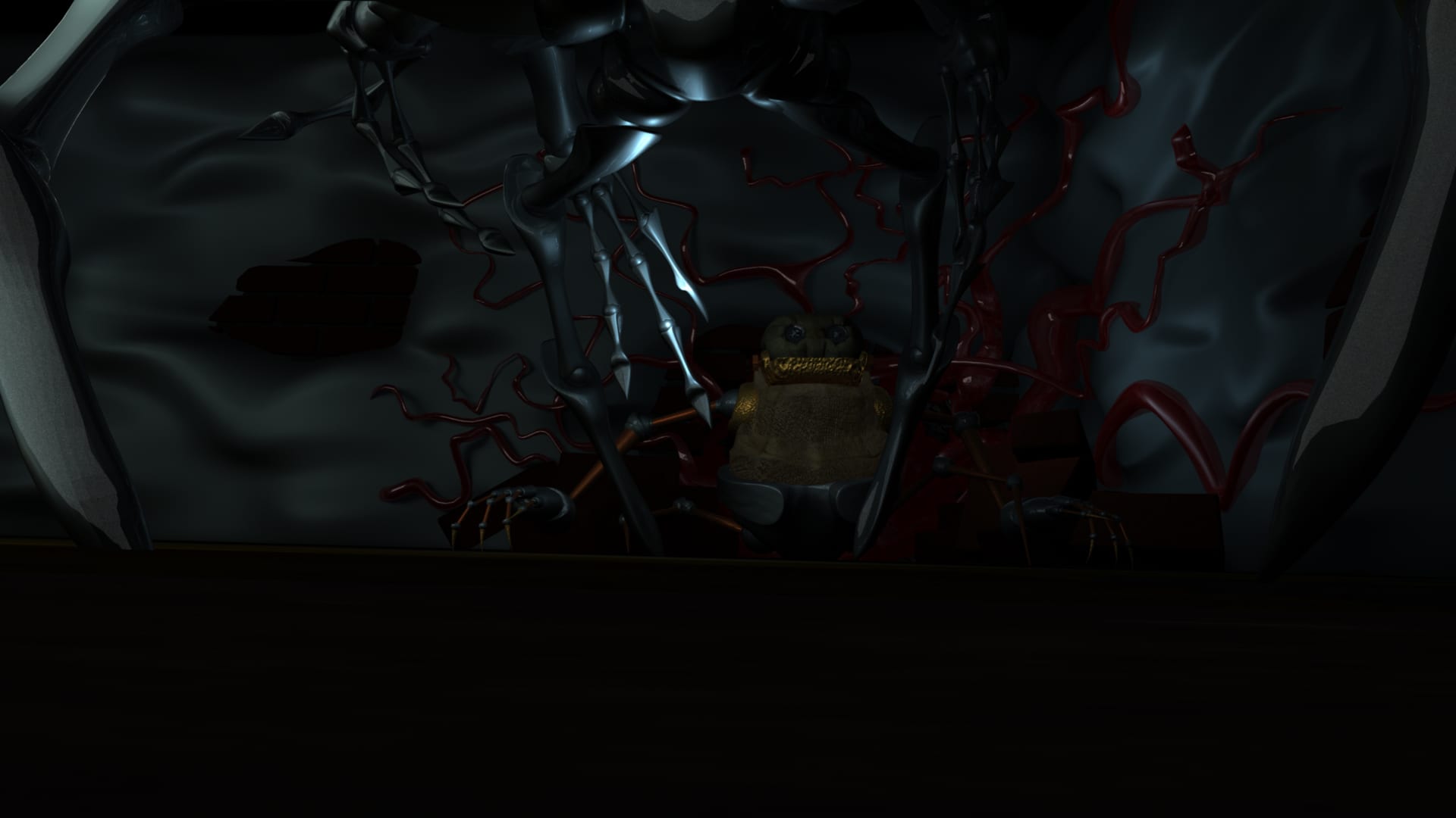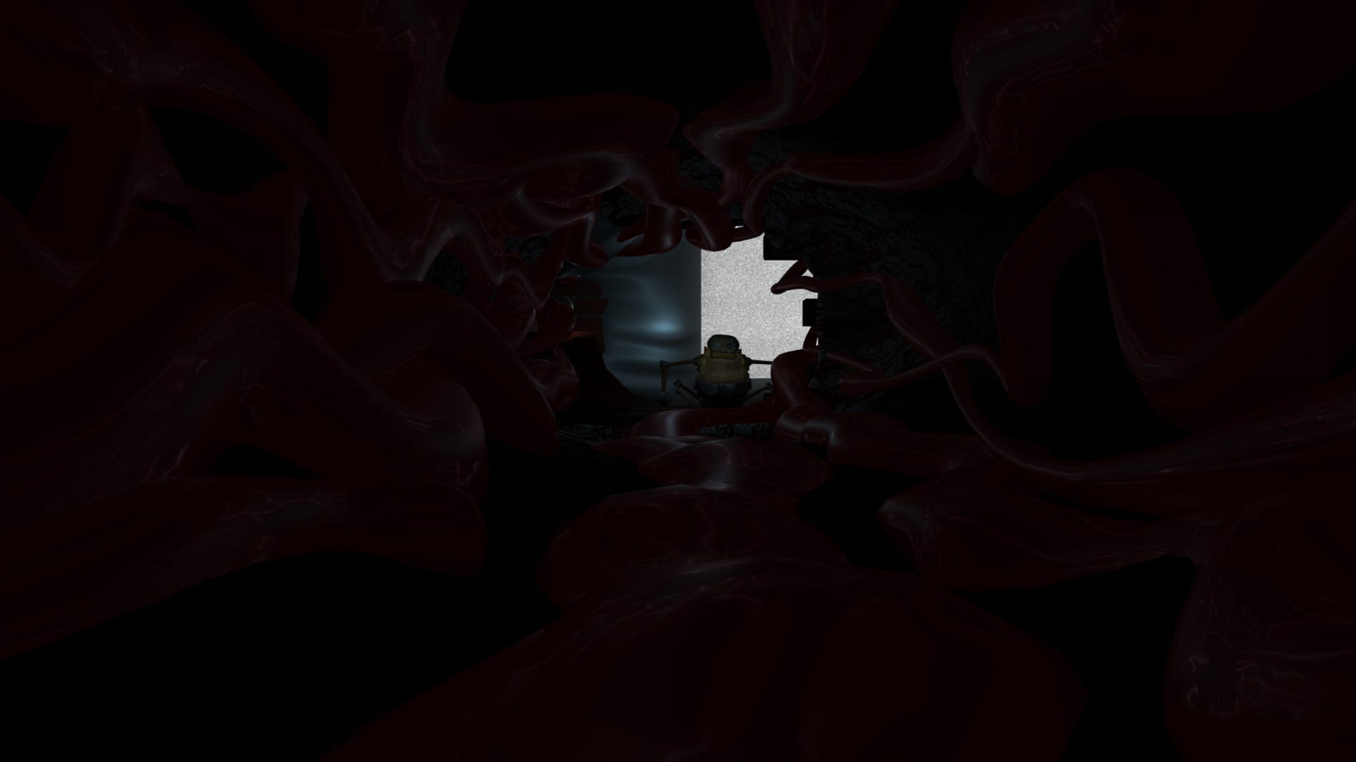 “The Hole in the Wall” is a 4-minute 3D animated short movie. The story begins with a sackcloth baby sitting in the middle of a room, watching static on a screen. An odd looking bug scuttles by, which the baby grabs and eats it. A bug like baby sitter sits in chair staring at the baby. On either side of her is are teacups; one with gambling chips, the other with fish. The baby sitter throws 3 chips followed by a fish at the baby’s head. This knocks off the baby’s head.