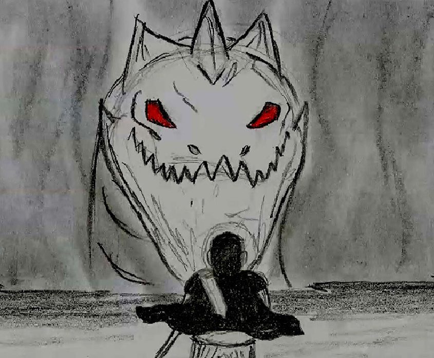 What started as a child imagining being a knight in a fantasy world, became a focus on the fantasy itself.  Taking away the child from the story but maintaining the idea that this is a story that a child would imagine, using scribbled visuals to emphasise that.