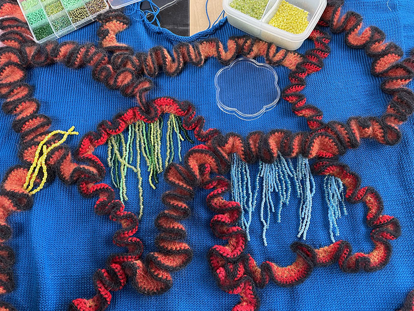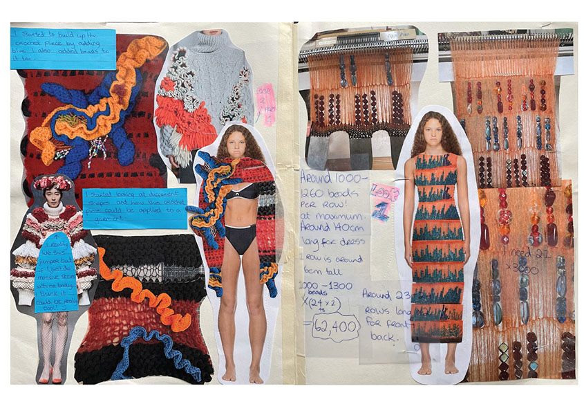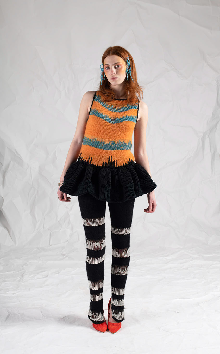 This collection was inspired by the International Firework Festival in Malta. I wanted to portray the atmosphere and excitement that surrounded the week-long festival. The dark skies, the cold breeze, the bright colours, the sounds, the people. There was something so spectacular about the immense size and scale of the fireworks and seeing people’s reactions to each one. I wanted to capture the experience of the festival from how I felt and remembered it months afterwards. I utilised different coloured glass beads to encapsulate the brightness and shininess of each firework. I shaped my crochet pieces of Look 1 into circles, depicting the ground fireworks called ‘ġigġifogu’, which rotate in circular patterns. Capturing movement was important to me while making this collection and so I incorporated beaded fringing and knit stitches strung with beads that swish and flow when worn.