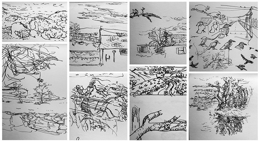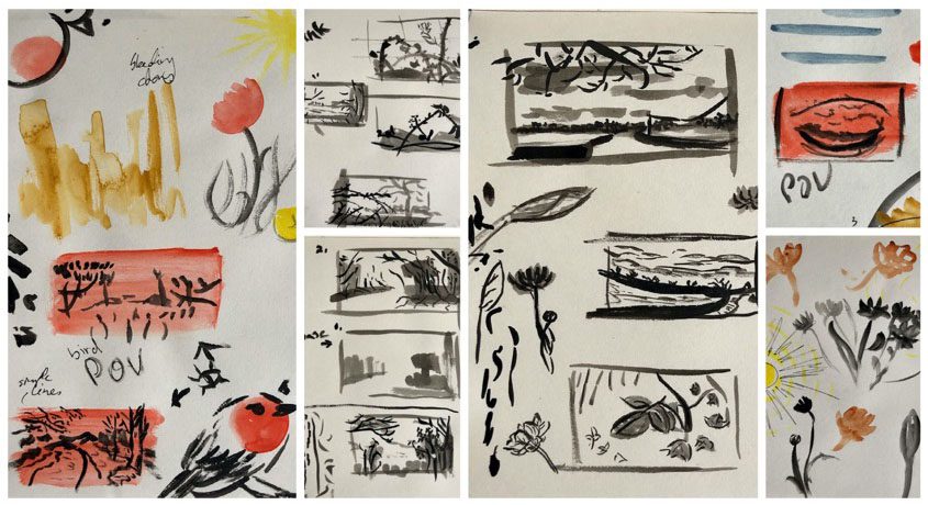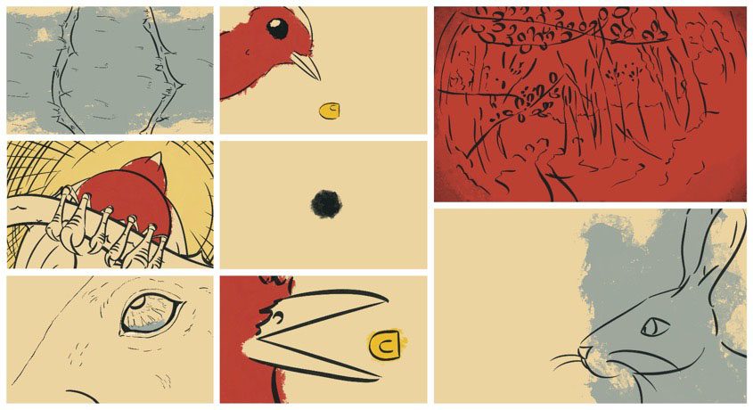 Spideog is told through simple black linework. The line fluctuates between calm stillness and uneasy boiling to coincide with the tension in the piece. Swatches of primary colours accompany the simple lines. The visuals flow in a naturalistic way; akin to the ever-flowing flora and fauna of the Irish countryside.