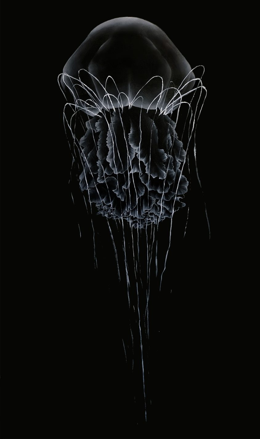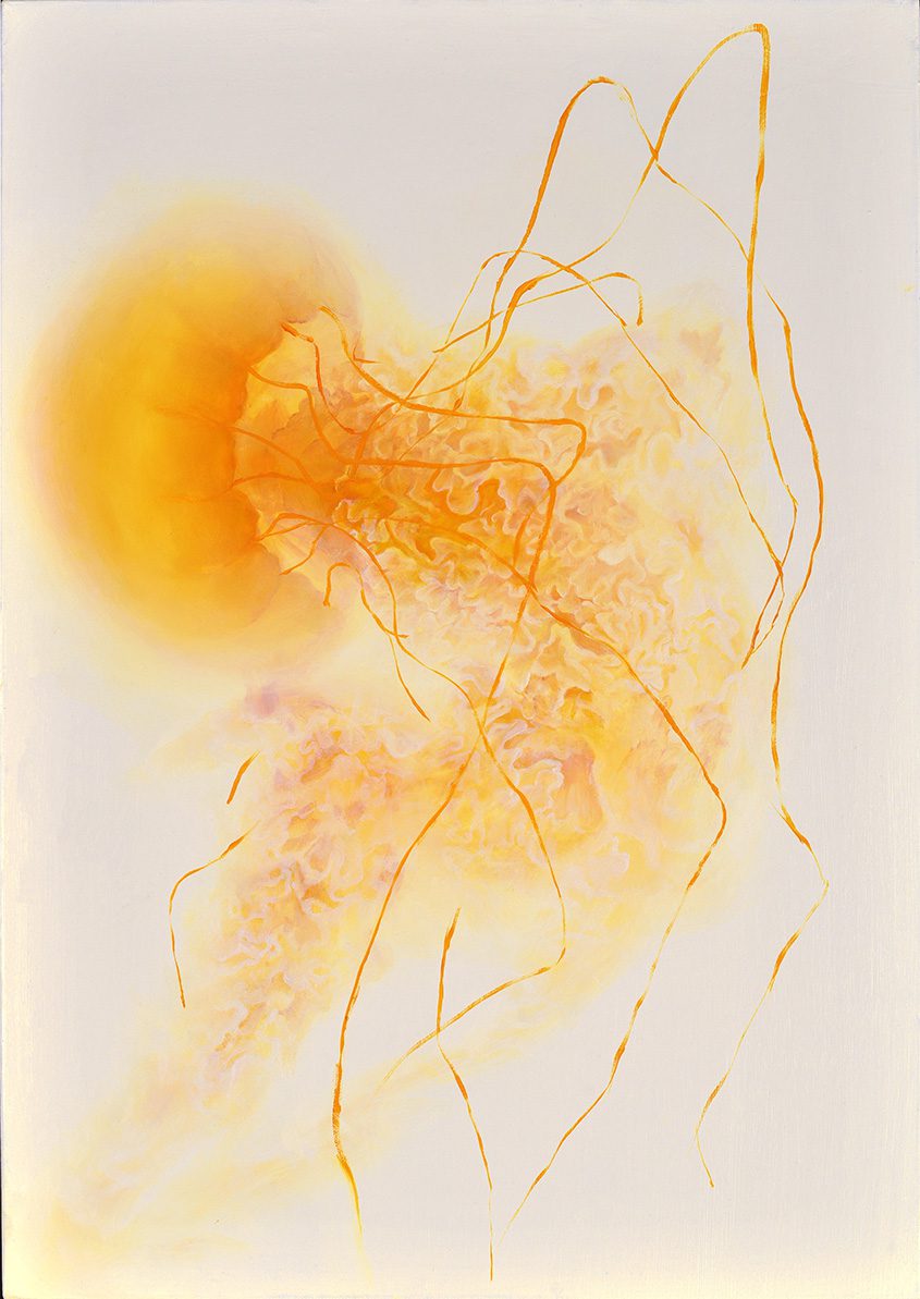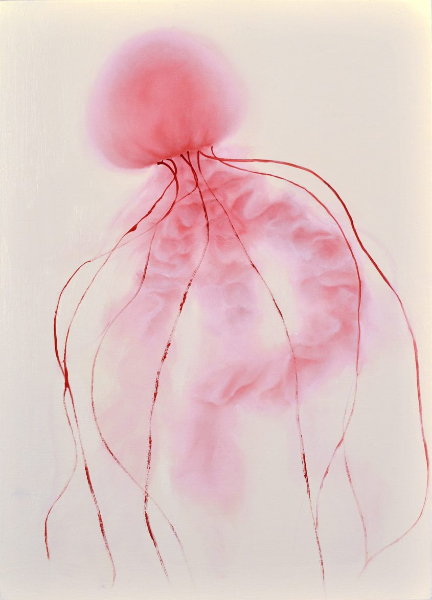 Jellyfish themselves are a staple of aesthetic online imagery. In researching such imagery, she found herself scrolling mindlessly as the pictures took on a new meaning away from the gelatinous blobs she had so often kicked on the beach. Her existence online felt like floating in overwhelming algorithmic currents. Online images are fleeting, with emphasis on rapid consumption, compared to art displayed, asking for contemplation. Duggan ruminates on the nature of painting as a medium of creating images, versus as a means of creating objects. Painting is often associated with the making of a picture, as opposed to the crafting of an object. Is the “painting” then the physical oil on canvas or the picture it represents?