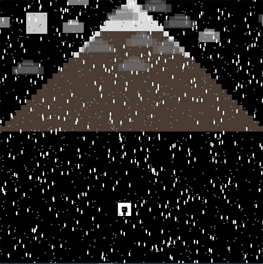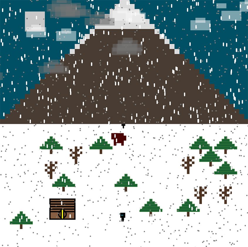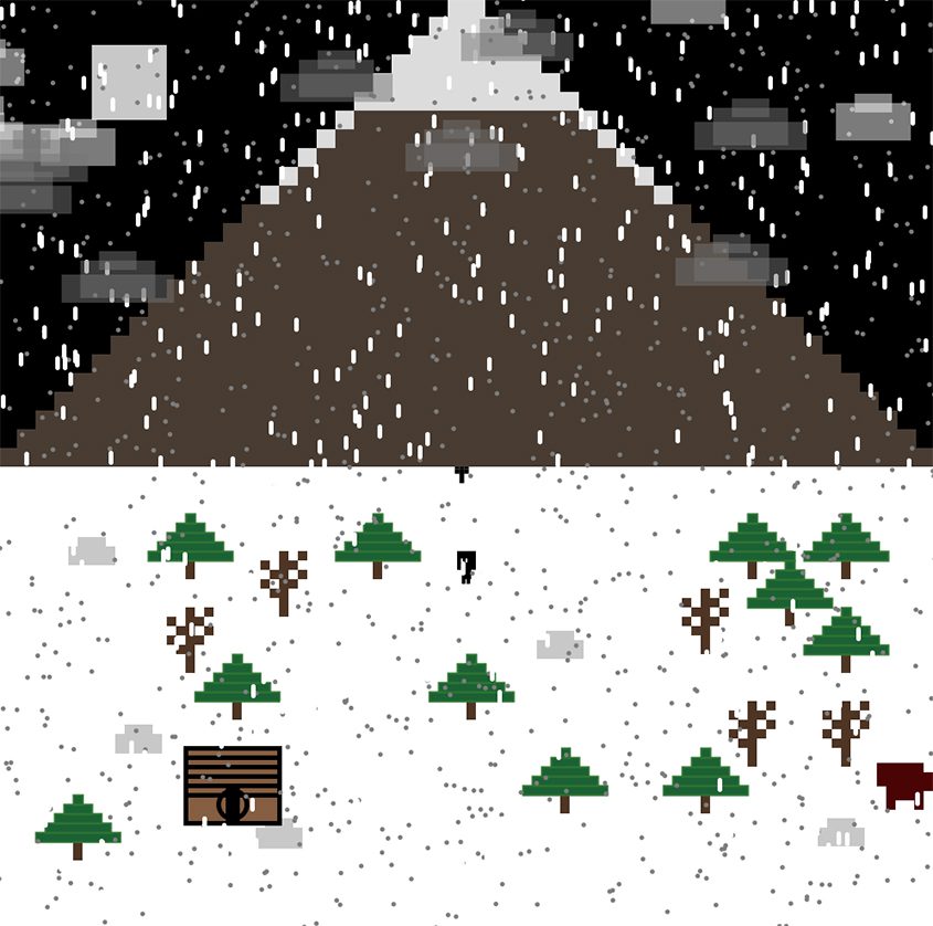 Isolated was created in Processing 3 for my AVDSP 2 project. Isolated is a short horror/adventure game inspired by games like “Undertale”, “Hotline Miami”, “Silent Hill” and “Helltaker”.  The game takes place on a snowy mountain where the player is out in a blizzard. The goal of the game is to dig 5 snow piles to enter the cabin. You will have items to assist you on the way which take form in the lightning bolt which doubles the speed of the character but also speeds up the bear and the vision item which increases the character’s field of view. There is also a bear that the player will have to avoid.
