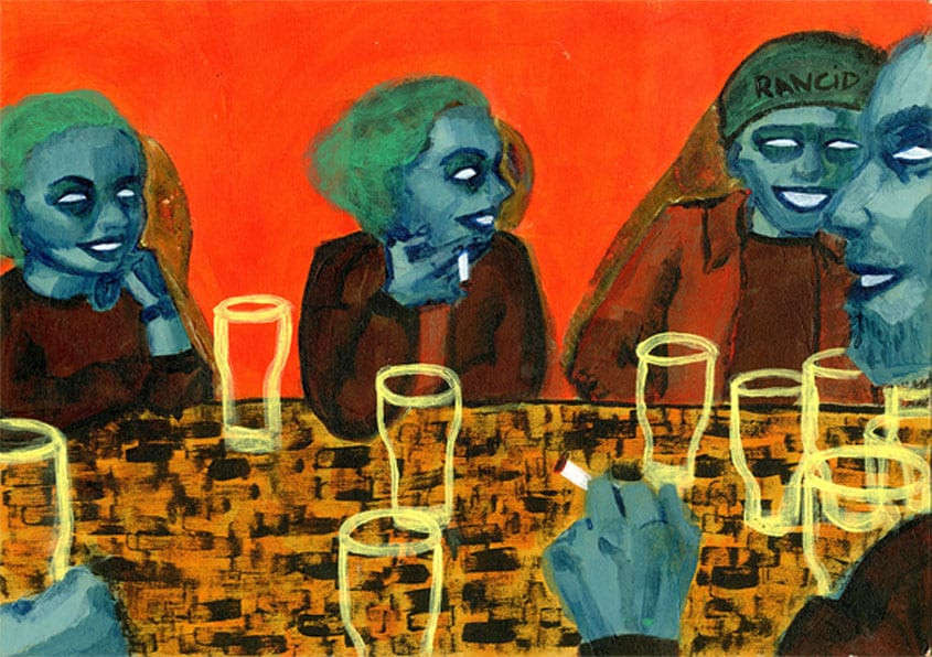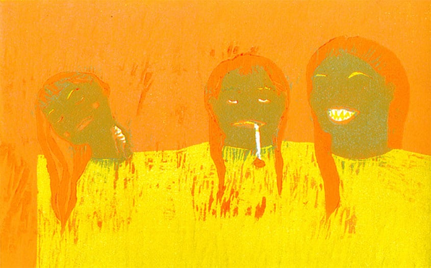 The girls are characterisations of different traits and personalities that we often compartmentalise, the blue faces here act as masks. Often behaving badly, they are products of self-loathing and self-sabotage. The figures revel in an artificial world, in an occupied headspace that is arguing, shouting and queasy from its self.
