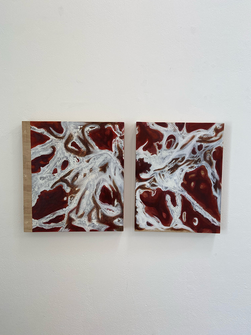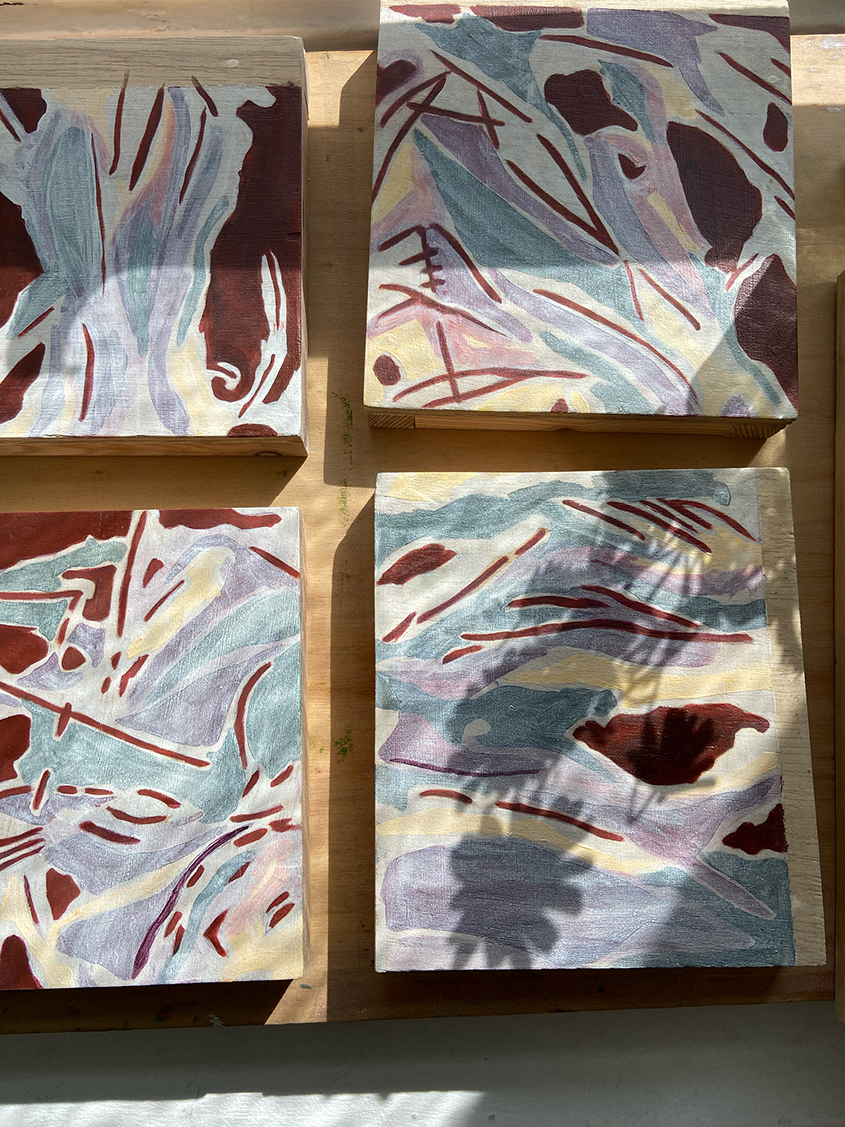 The organic structure of the haystacks became a point of interest, the abstract lines and forms of the grasses inspired a series of prints which have been used as a mapping support for the paintings. Through abstraction and distortion of the prints her work explores organic forms and lines. The conscious use of positive and negative space both in the paintings and in their compositions allows the work to interact with the surrounding space. By juxtaposing these opposing forces, she creates a sense of tension and balance within her compositions, inviting viewers to contemplate the interplay between different elements.