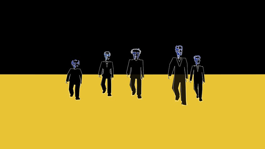 The visual style of the piece is contemporary and simple.  Stripped-back colours and shapes emphasise the angular, graphic stylistic choices.  These angular shapes are representative of the strong emotions portrayed.  Yellow is symbolic of chaos and madness.  The dry desert setting embodies the agoraphobic, lost, bewildered state of mind of the protagonist.  This film was created with a variety of different techniques.  Dynamic camera movements and choppy editing are used to emulate the protagonist’s state of mind.  This mindset of spontaneous reactions and lack of logical thought process is prevalent throughout.