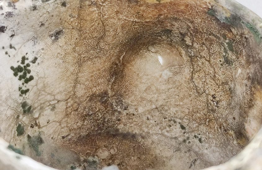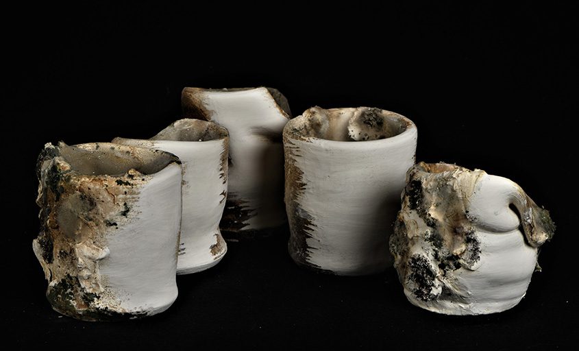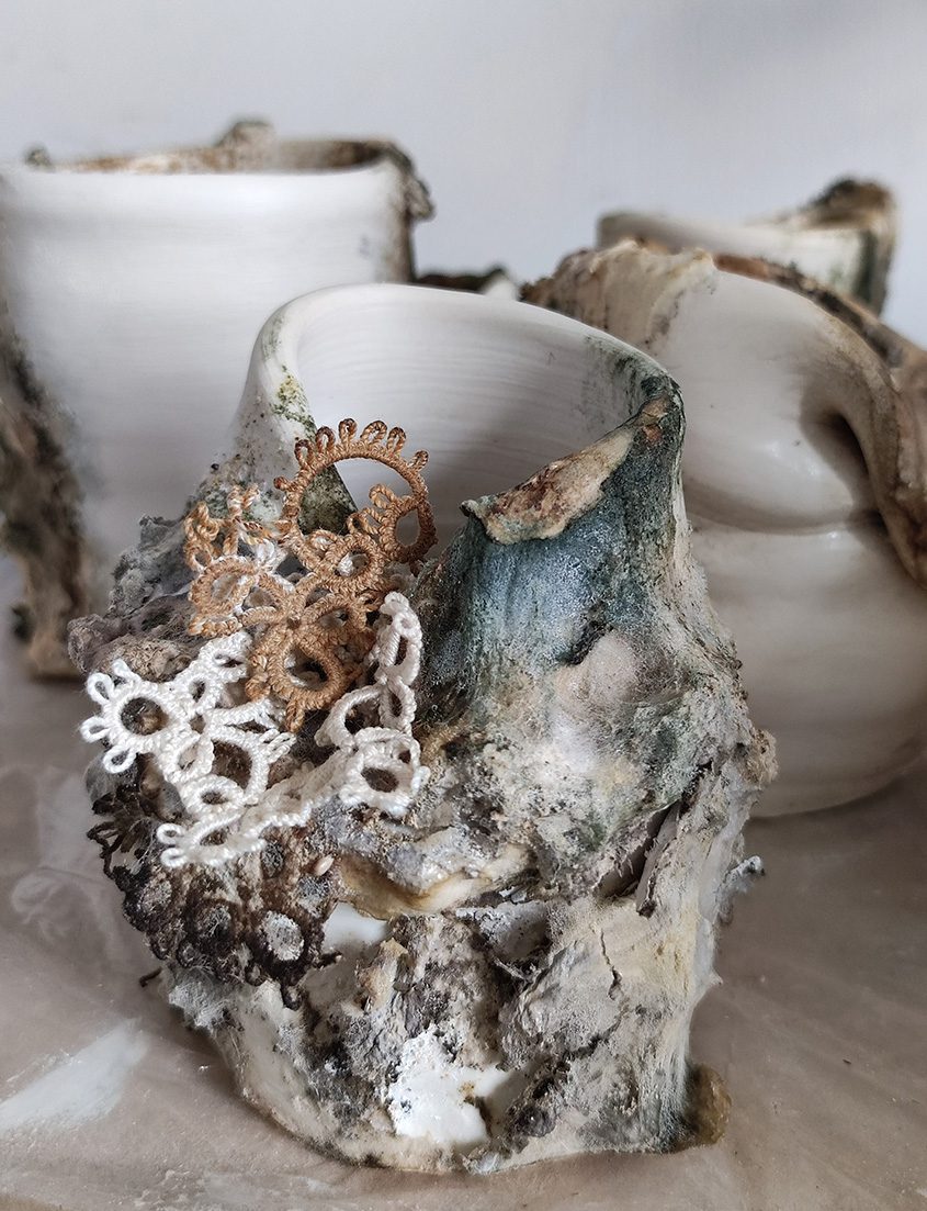 The vessel becomes a metaphor for the human condition, made on the potter’s wheel to reflect the progressive, circular, and hopeless nature of depression. I use tatting to show our sensitive self through its delicate and fragile structure. This contrasts with solid, mould-covered clay forms of the vessels. The juxtaposition of these materials comments on the lasting marks that depression and negative experiences from human relationships leave on our bodies and psyche.