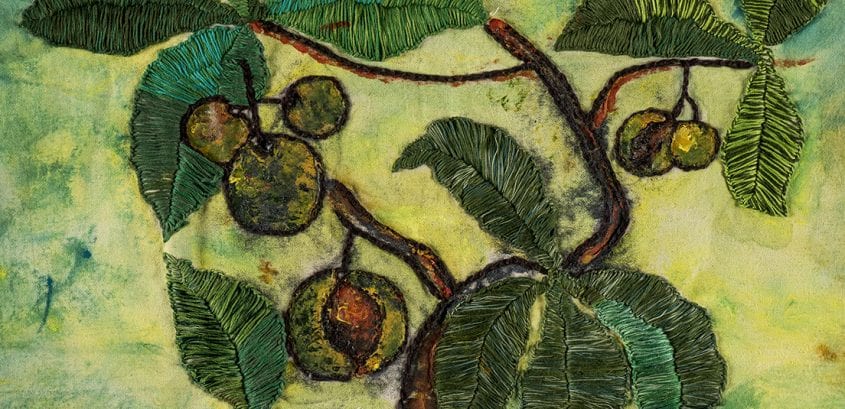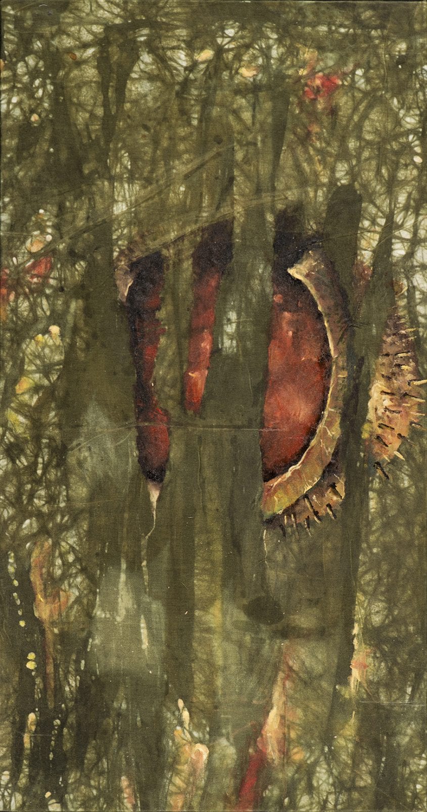 In the batik side panels, the chestnut represents Ireland and the tamarind Kenya.  Seeds represent the abundant life and hope for the future that nature offers.  The central panel reflects the African idea that nature is spirit-filled and deserves reverence. African Masks were traditionally used in ceremonial celebrations to represent the spirit world and were believed to be endowed with magical powers.  Red paint represents the tears of the forest shed for the destruction visited on nature today.