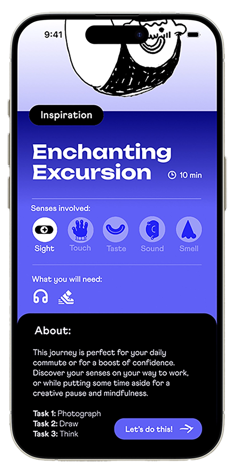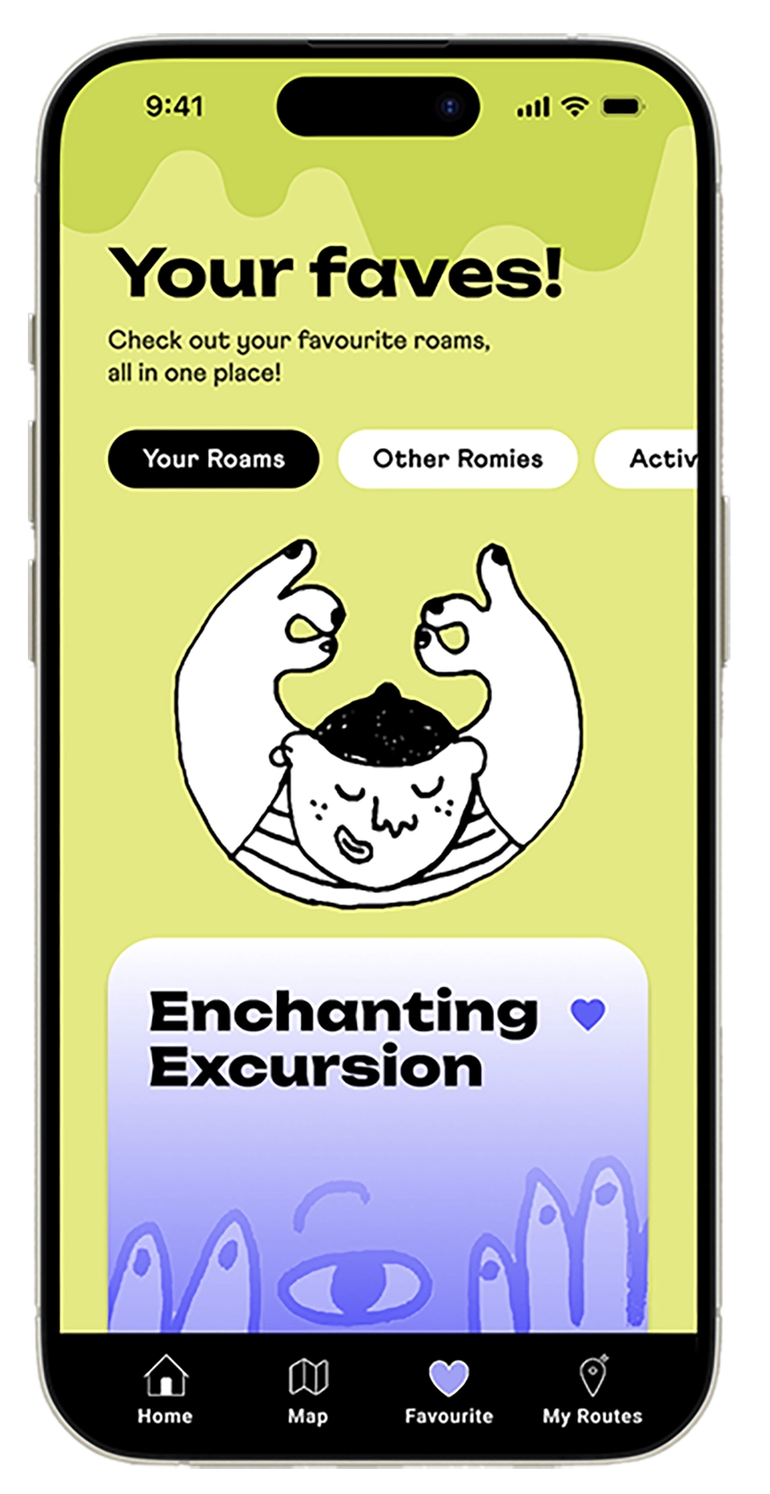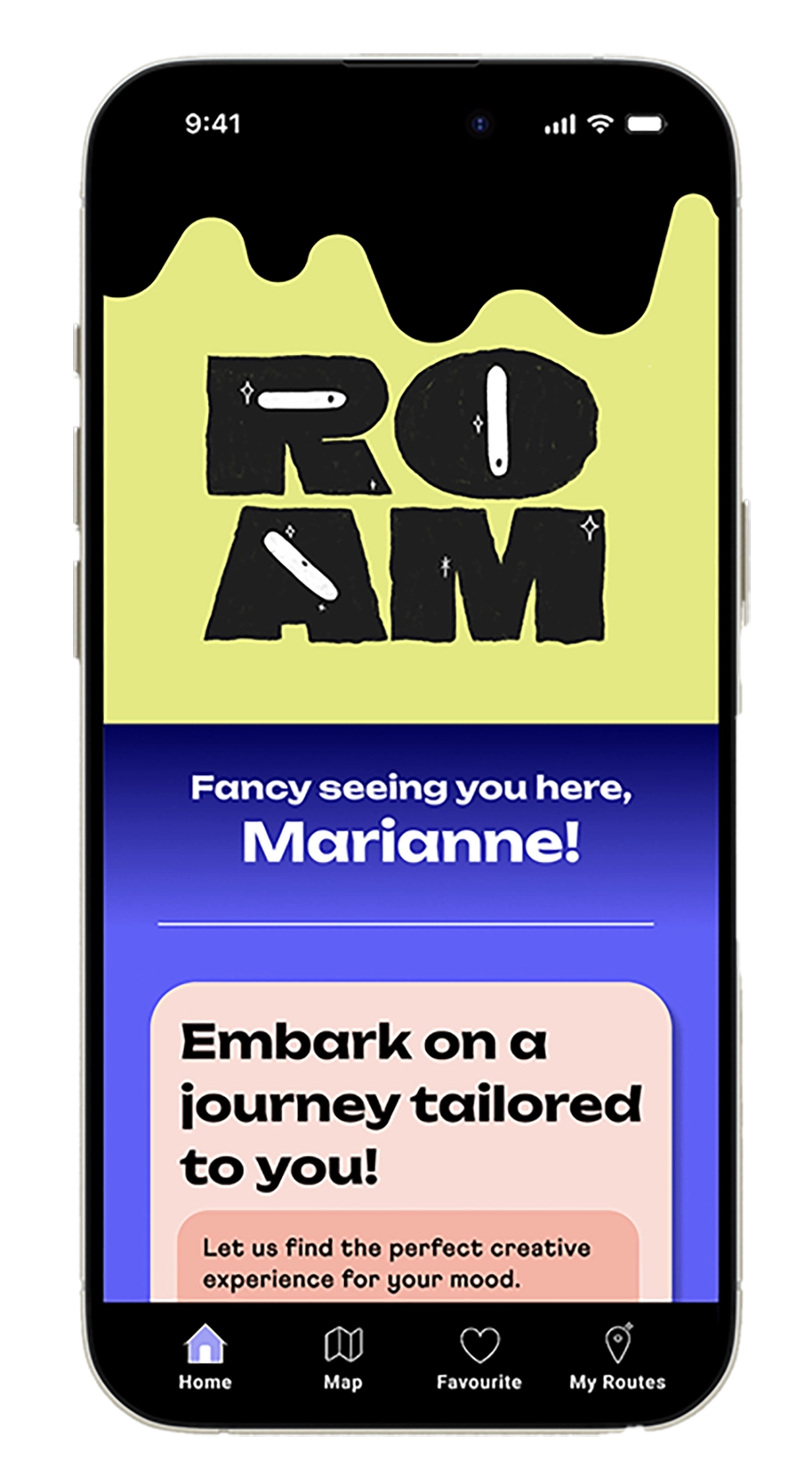 This app was created in a group of three and is designed for individuals seeking new creative stimuli. It is capable of guiding the user through a sensory experience, exploring space with an entirely new perspective. ROAM is intended to be used by people experiencing creative block or simply seeking inspiration, while adapting to the daily needs of the individual. It can be used anywhere and allows the user to create both a virtual and personal space. The app can help users who are seeking pauses to get back in touch with their creative selves.