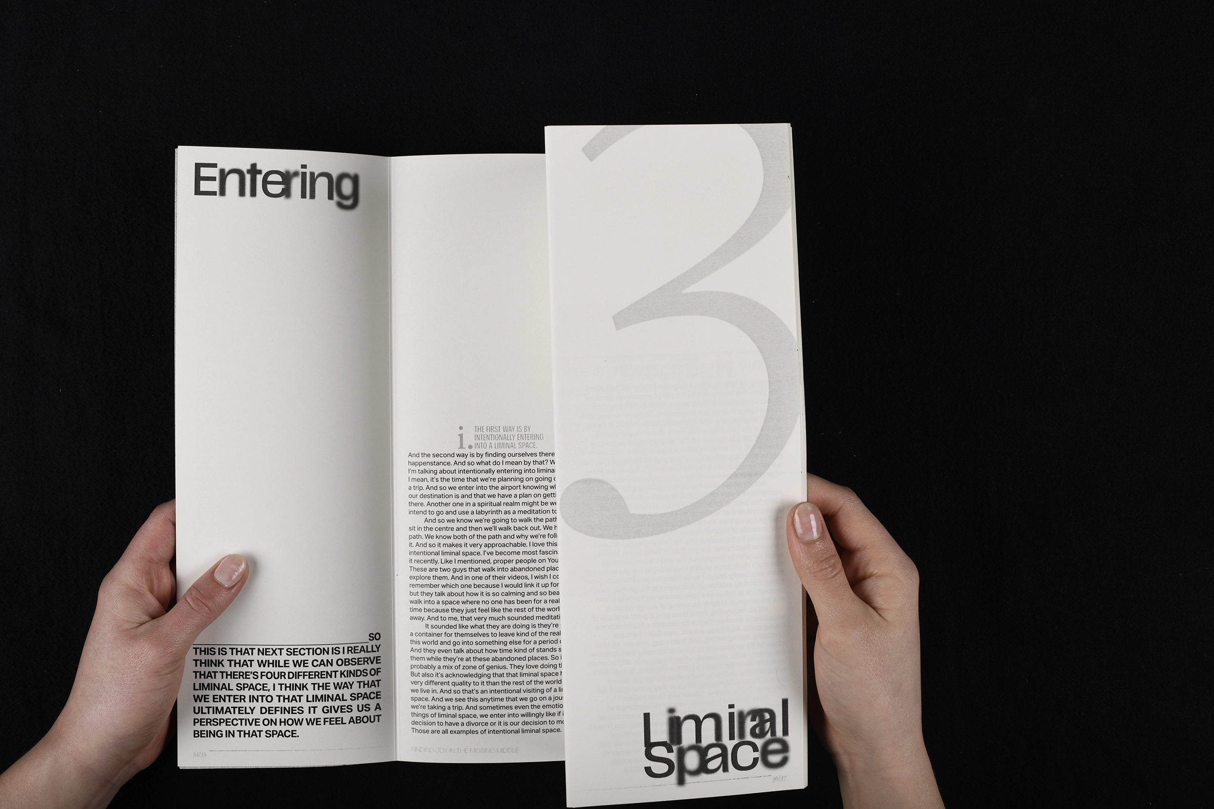 The format of the book challenges traditional reading experiences and offering a unique, immersive encounter with the concept of liminality. The design choices – including typography, layout, and format – each contribute to forming a sense of transition, ambiguity, and discovery of the in-between. The target audience includes those who are intrigued by philosophy, psychology, and fascinated with the in-between. These are lateral thinkers who naturally question and explore beyond societal expectations.