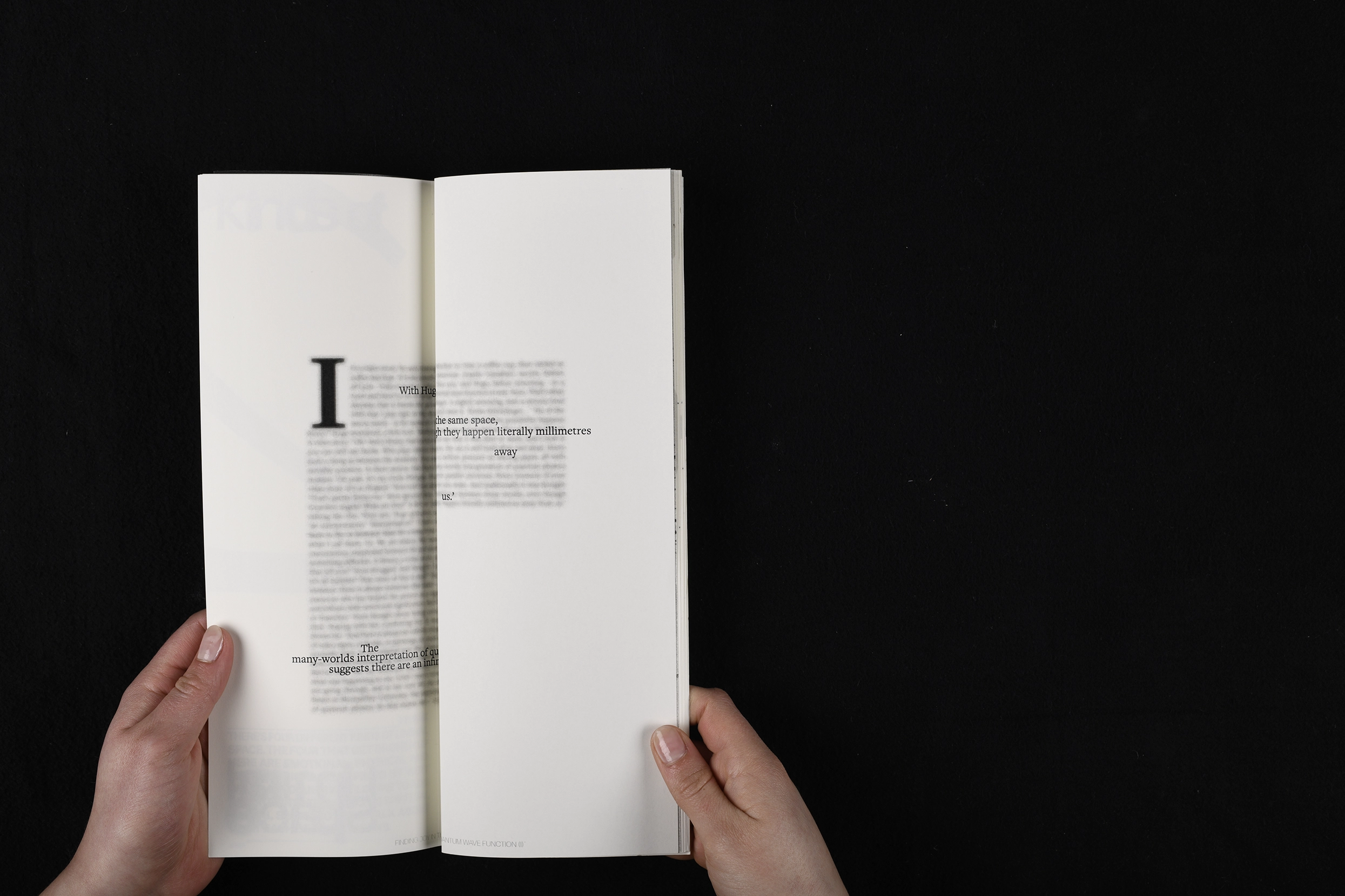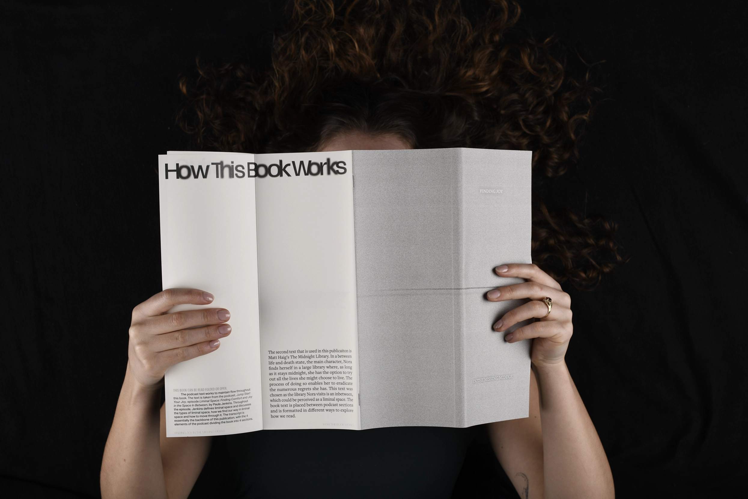 The podcast text is the backbone of the book and is divided into four sections. The book text appears between these sections and is used as an exploratory typographic expression. The Midnight Library explores the in-between of life and death. This works in two ways, with the library being a liminal space as well as the holder of books.