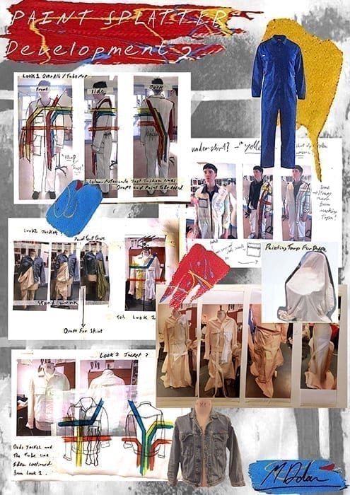While working as a painter decorator he travelled all over London using the tube. I used the 1970s map of the underground to create interesting and innovative pattern cutting and also used my dad’s real work clothes as a base for the collection. The collection starts with his overalls and moves from work wear into casual and then to slightly more formal. This was to show the flow from work life to personal life. I used drape inspired by painters’ tarps draped over furniture to protect them from paint splatters, as a way of bringing interesting shapes into the garments. The collection is unisex with a masculine edge as the base is from my father’s actual clothes, while the drape makes it slightly feminine. The colours are loosely inspired by the tube map, a white background with different colour lines traveling through each look. I then used house paints splatter on the garments to give a contemporary look to each garment. With workwear in mind the main fabric of the collection is a white denim drill and cotton. I then used waxed cotton, PVC, and masking tape for details, the PVC is also used to give a wet look to enhance the collection.