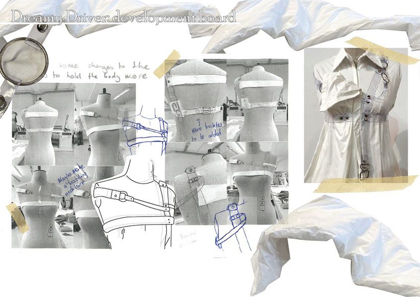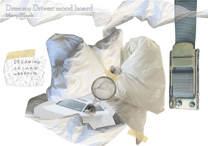 A restrictive element found in the harness embodies the impact of the crash within the dream offering protection like a seatbelt.’