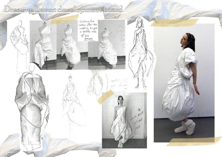 ‘This collection is inspired by a dream in which the designer crashed a car into a lake. Shape was found through draping based on the twisting and turning one faces in sleep, often resulting in gathered and bunched up bed sheets.