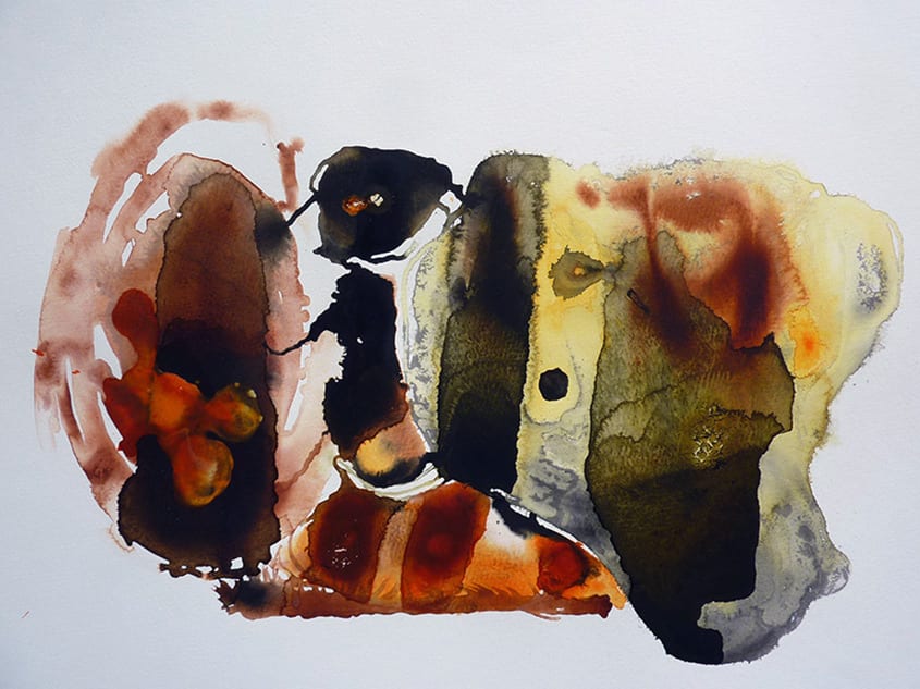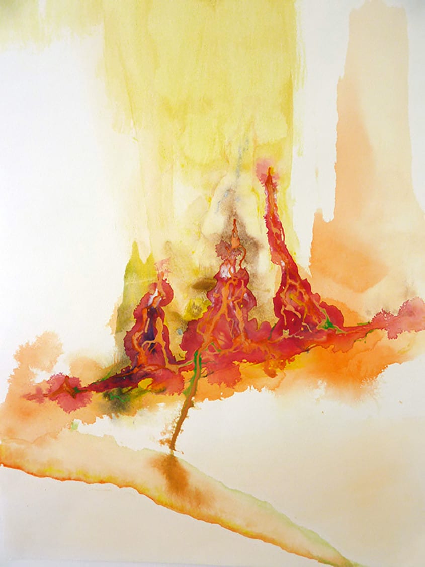 Painting watercolours entails a collaboration of the artist with a living medium that they cannot control, or erase. It will flow, settle, blend, separate, and invent on its own before it dries. It bears a resemblance to the unpredictable flow of nature.