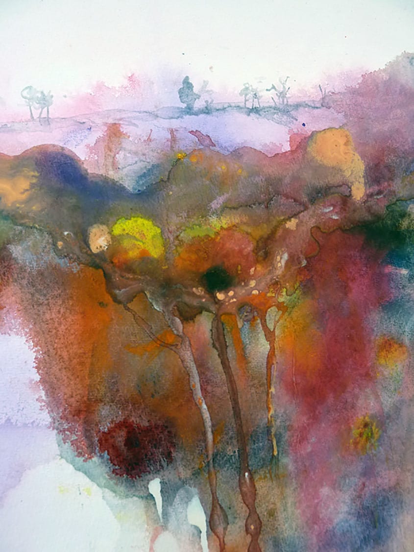 By abstracting the forms I try to create a sense of mood, atmosphere and beauty. Sometimes the compositions are suspended in negative space, and sometimes they create their own landscapes. The work developed from a process of staining, I started the process of staining paper and canvas, watercolour became a great medium for this, by pouring pools of water on paper and then injecting watercolour paint into the pools, as the water evaporates the pigment leaves patterns of sediment, sometimes forming organic branching arrangements.