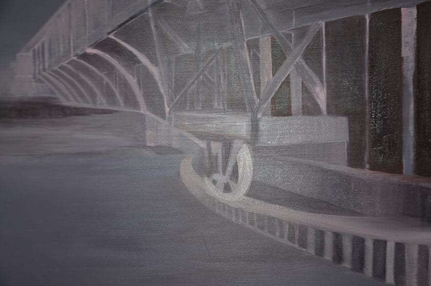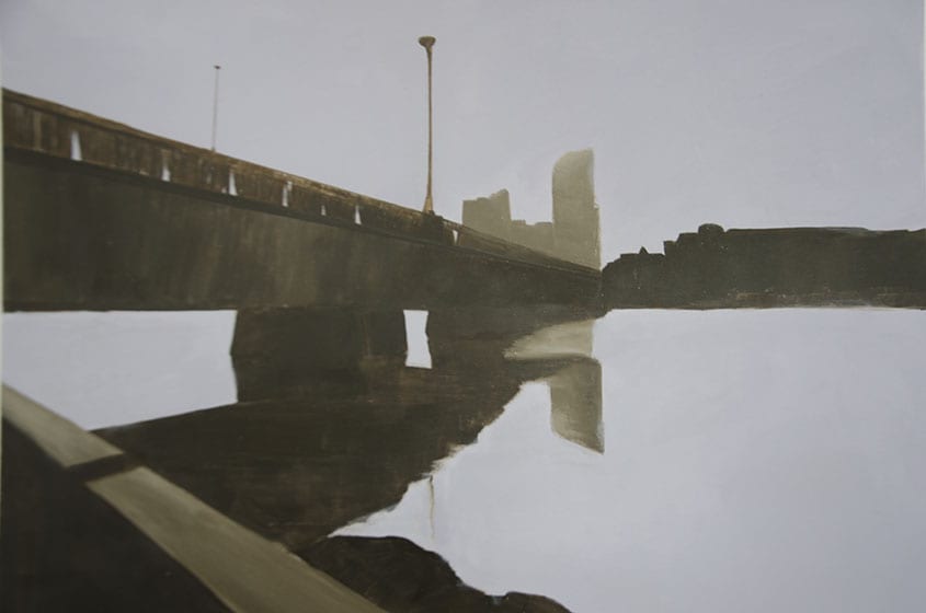 The content of my work is based on urban structures in the natural environment, concentrating on the Bridges of Limerick City. Placing my work in the context of seemingly forgotten places, where I see the architectural and natural environment having a dialogue with each other. In my painting I have completely erased the natural environment, taking the bare shapes of these images and erasing much of the surrounding detail. I feel in order to see something clearly, the object, needs to be taken from its setting and in the absence of the regular surroundings a new awareness emerges. The work explores aspects of pollution, alienation and isolation that is found along our riverbanks and bridges. In my images there is a parallel theme creating a sense of peace, tranquillity and hope, stretching across the City. These engineered structures that make up each of the bridges form the main focal point of my work both in my painting and photography. The various images create different yet recognisable shadow impressions, allowing a sense of ambiguity