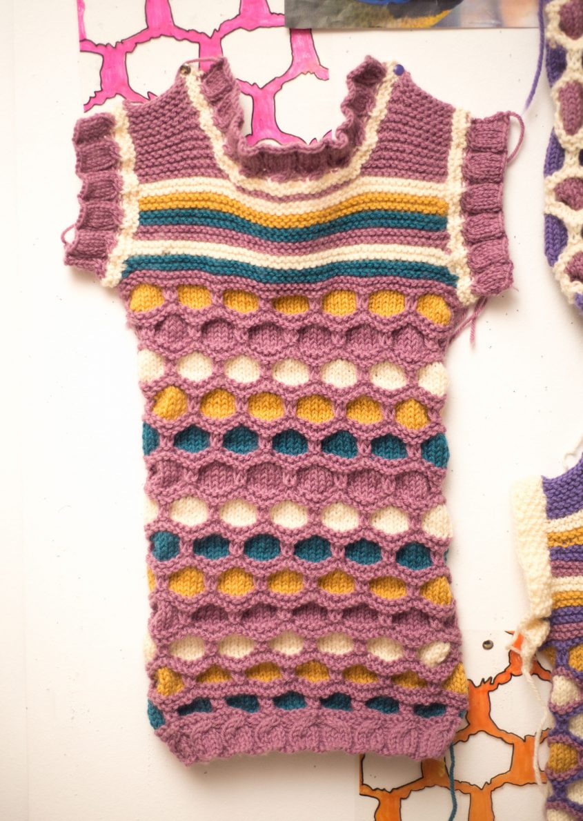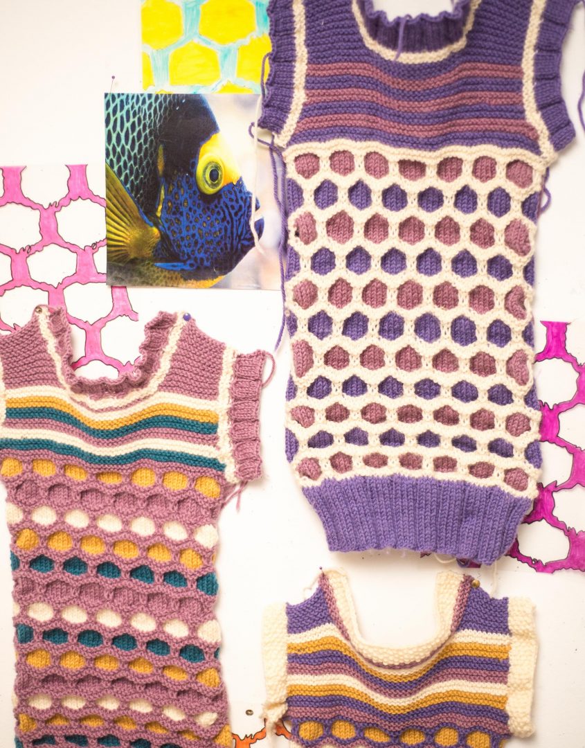 Using hand knitting techniques, I have designed and created a series of swatches. This work has been inspired by textures, shapes and colours of fish, creatures and the life that lives within this amazing deep-sea world.