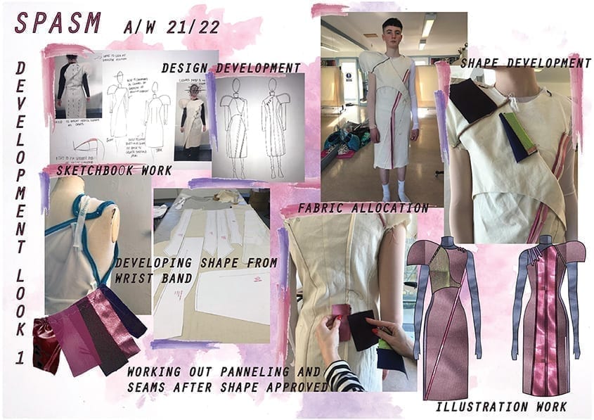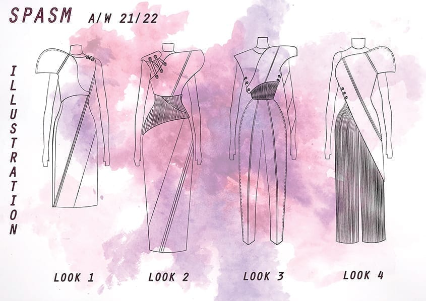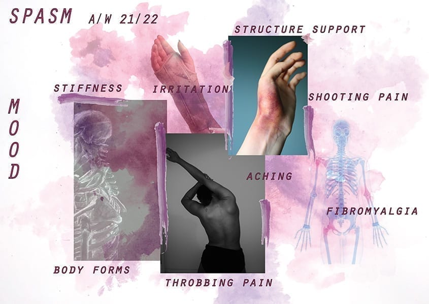My graduate collection ‘spasm’ is based on the chronic pain disordered called Fibromyalgia, which is widespread muscular pain. To feel like you have bruises all over your back, you are not able to sit or stand, feeling like your muscles are being pulled in ten different ways and then there are shooting pains. This all comes along with fatigue and mental stress and is known as an “invisible” disorder, meaning from the outside everything can look normal. This has been a life experience for me to learn to live with it and accept. I want to express through the construction of my garments the feeling of being restricted and create tightness around the body. My graduate collection is turning an issue that was something negative for me into something positive.