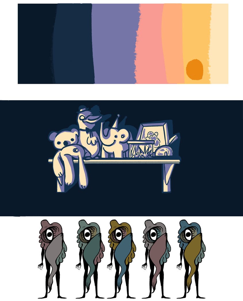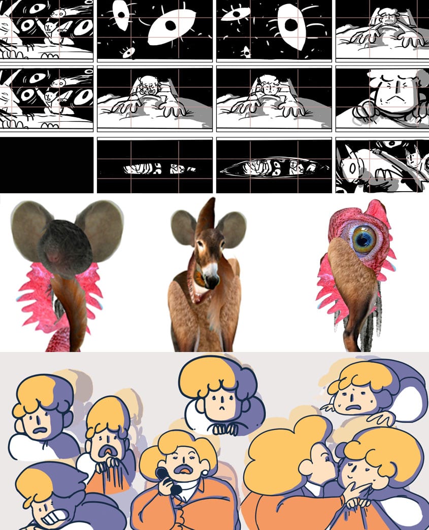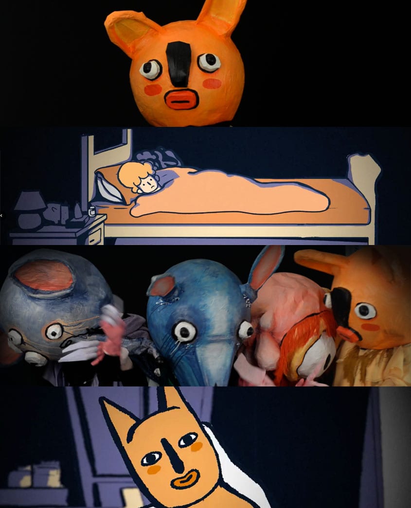 The piece explores the idea that the maternal support cannot always be available, but the love of a soft toy can be a great comfort until she can be there. Through the mixed mediums of 2D animation and film, the piece exhibits the beasts in garish, kitsch heads, manically terrifying the child. This is starkly contrasted to the playful animated scenes of his reality. By animating the boy in exaggerated curves and shapes, he displays a liquid-like form, to represent the foreboding feeling of illness.