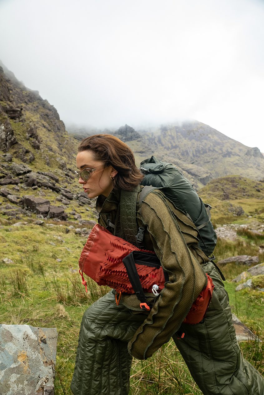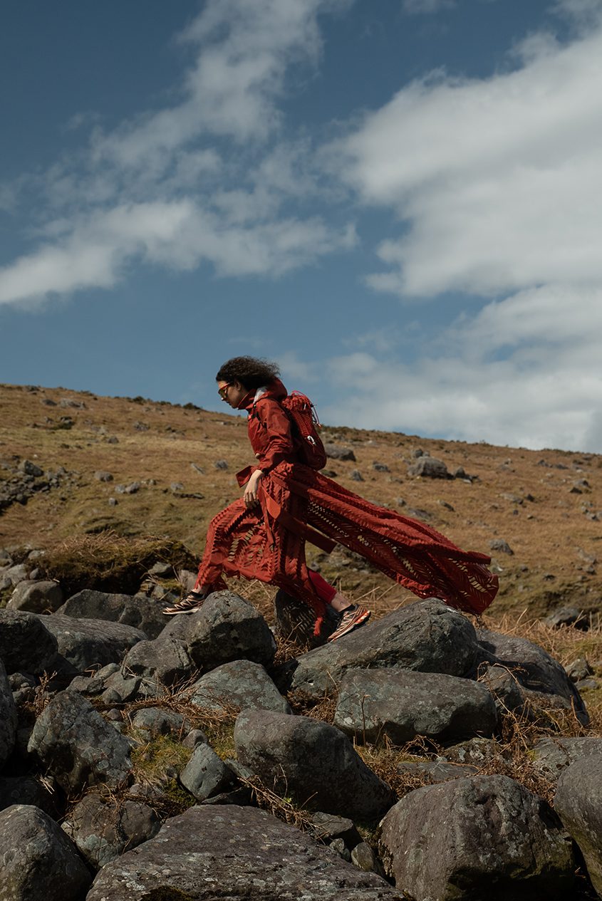 This project is built in the combination and exploration of Eastern Asian traditional garment construction, along with Irish primary research in colour, material, and function. Michéal takes inspiration from Japan’s Mount Fuji and how it is viewed as an iconic symbol of Japanese and Asian history and culture. With Carrauntoohil, Ireland’s highest peak, he derives inspiration from the mountainous regions and vast green landscapes that are so famously associated with Ireland. Looking at the two mountains synonymously, the project is an homage to the mountains and an appreciation for their natural textures, patterns, structures, and colour. From this, Micheal makes work inspired by the practicality of outdoor garments and the functionality of traditional Asian silhouettes.